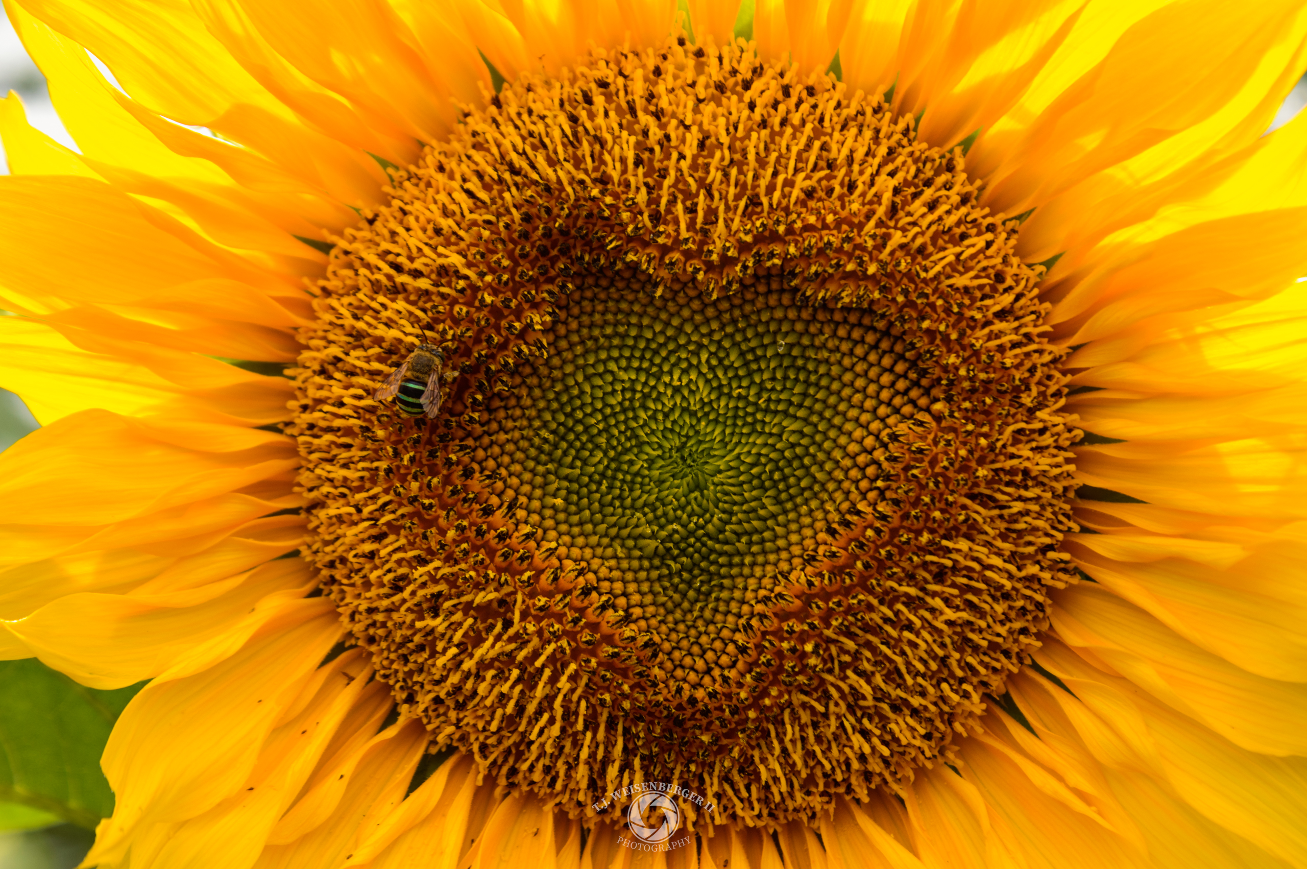 A blue-banded bee visits a sunflower on a local farm.