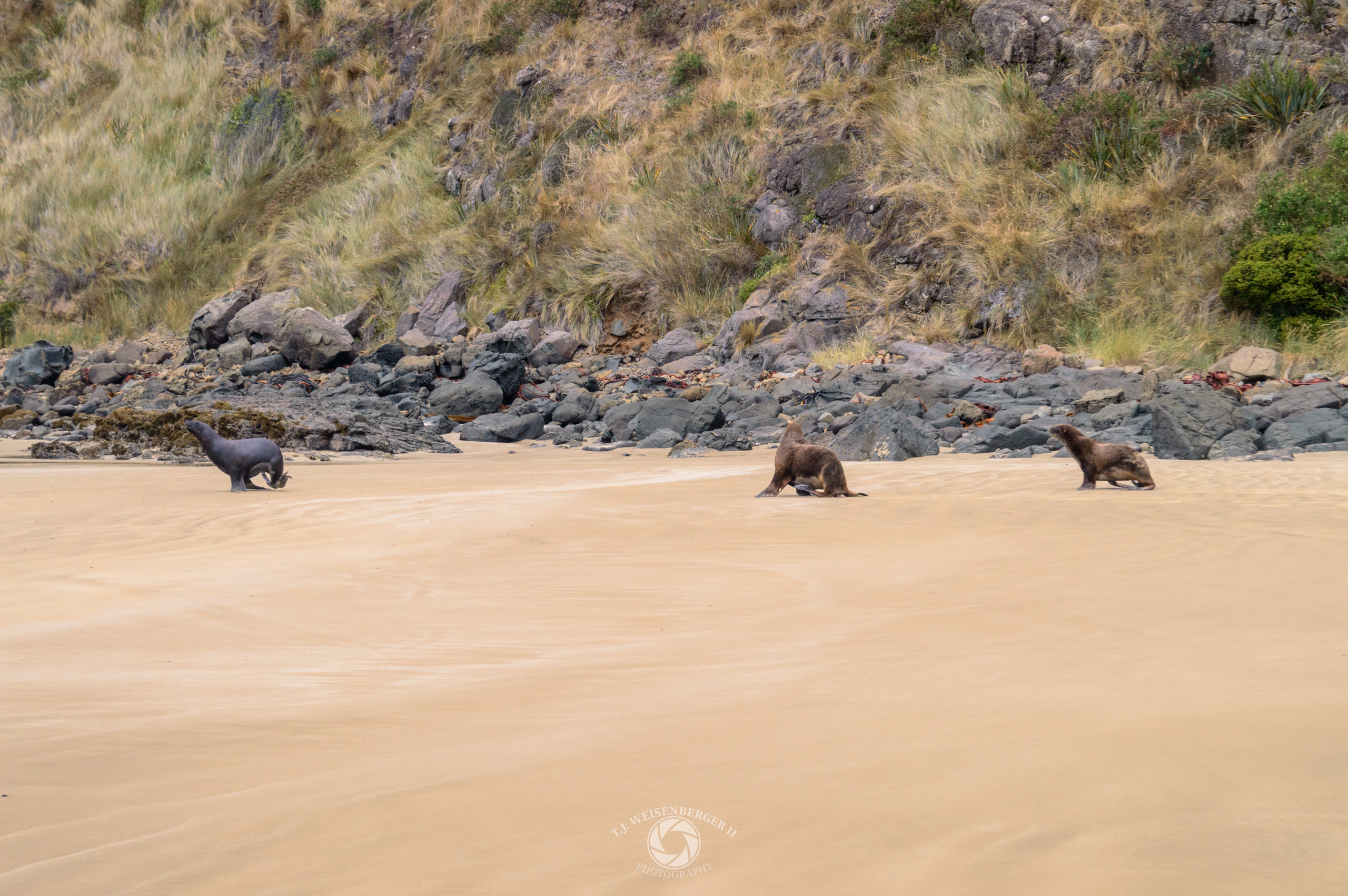 Hooker’s sea lions engage in a mating dispute on the beach.