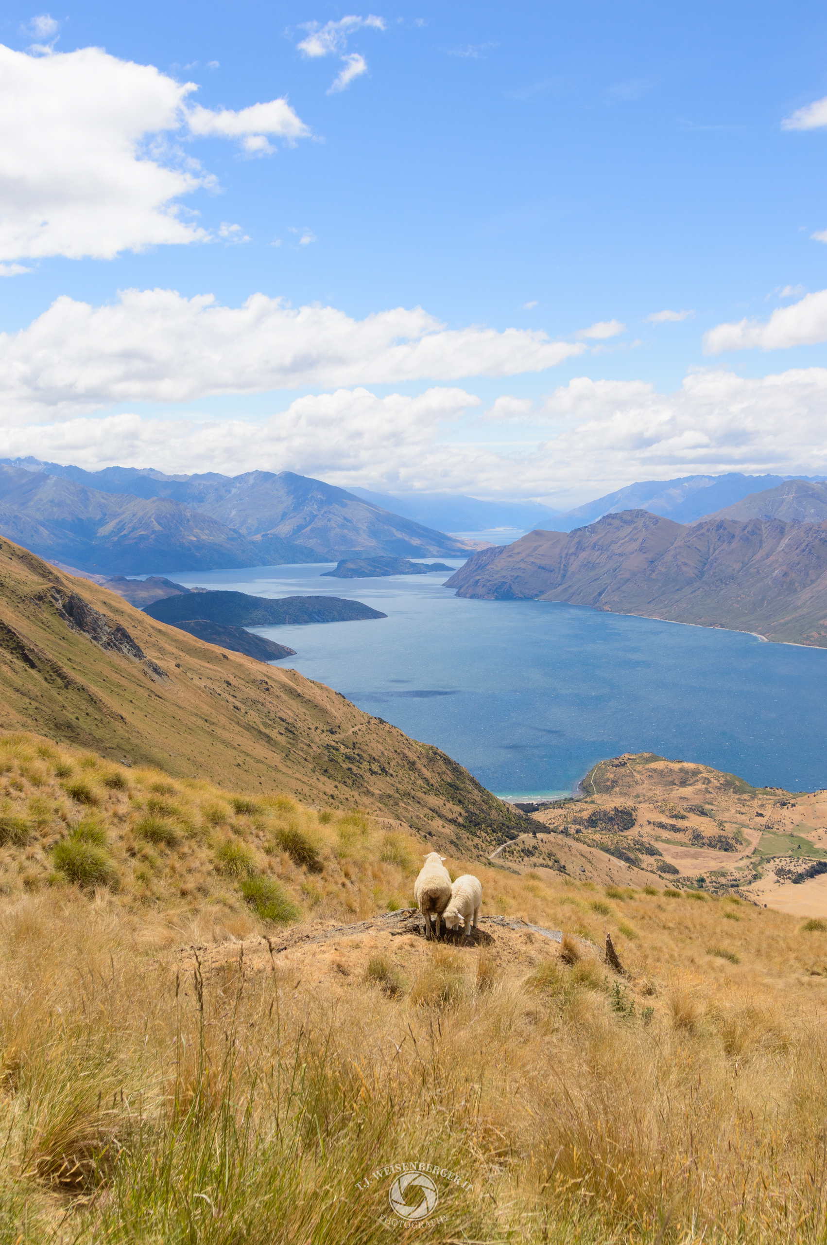 Two sheep pause on the ridge, gazing out over Lake Wanaka.