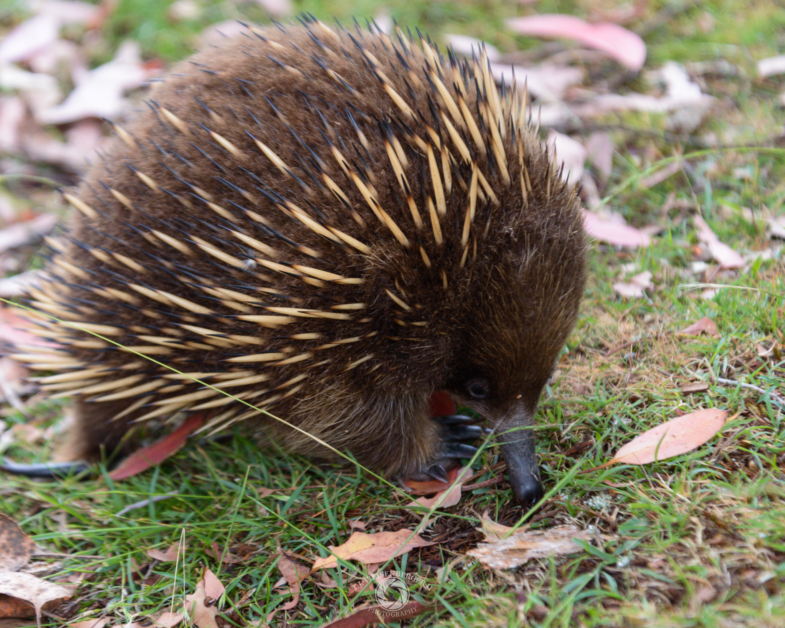 A short-beaked echidna, Tachyglossus aculeatus setosus, forages for ants.
