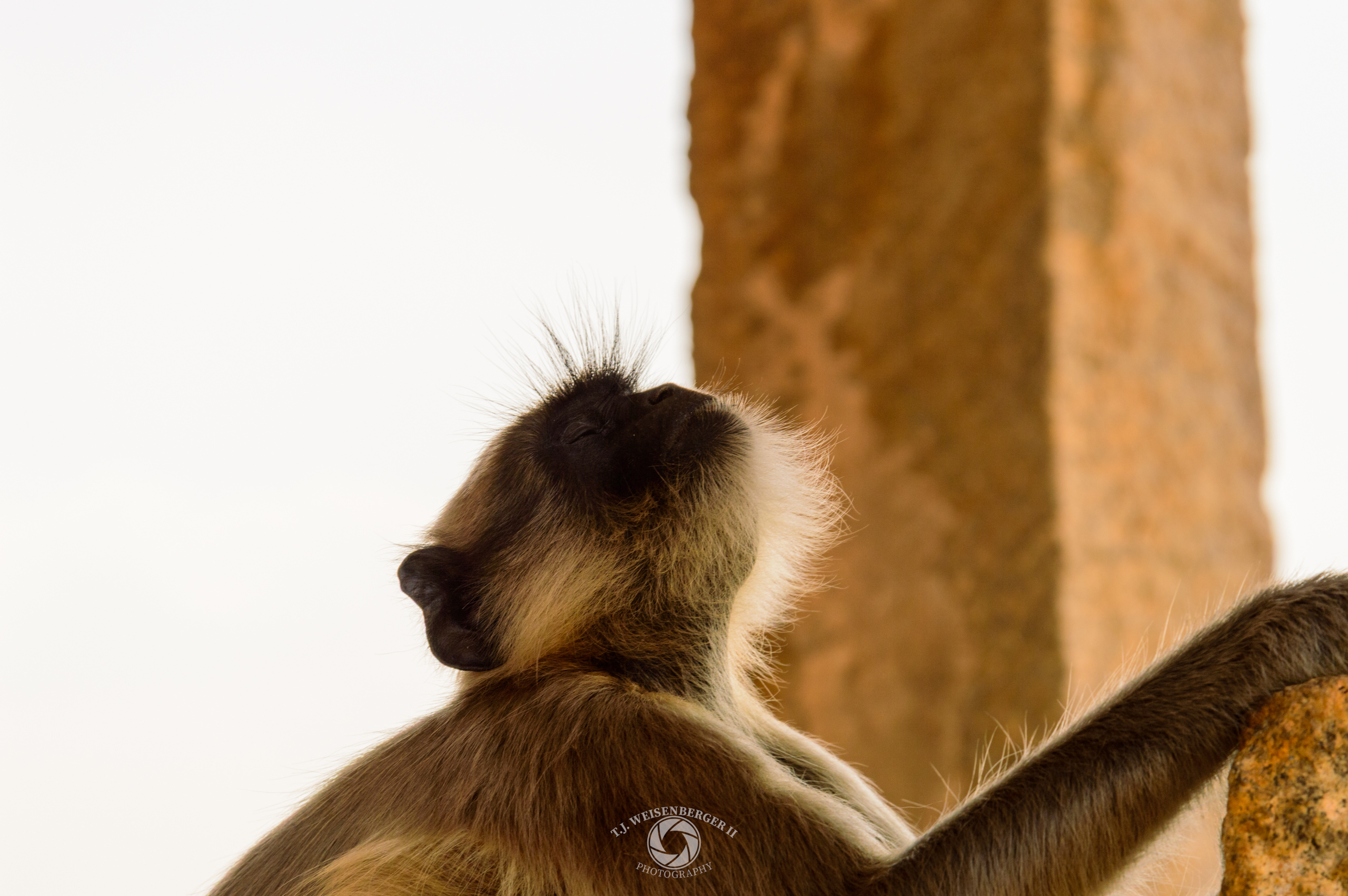 A Hanuman langur rests among temple ruins.