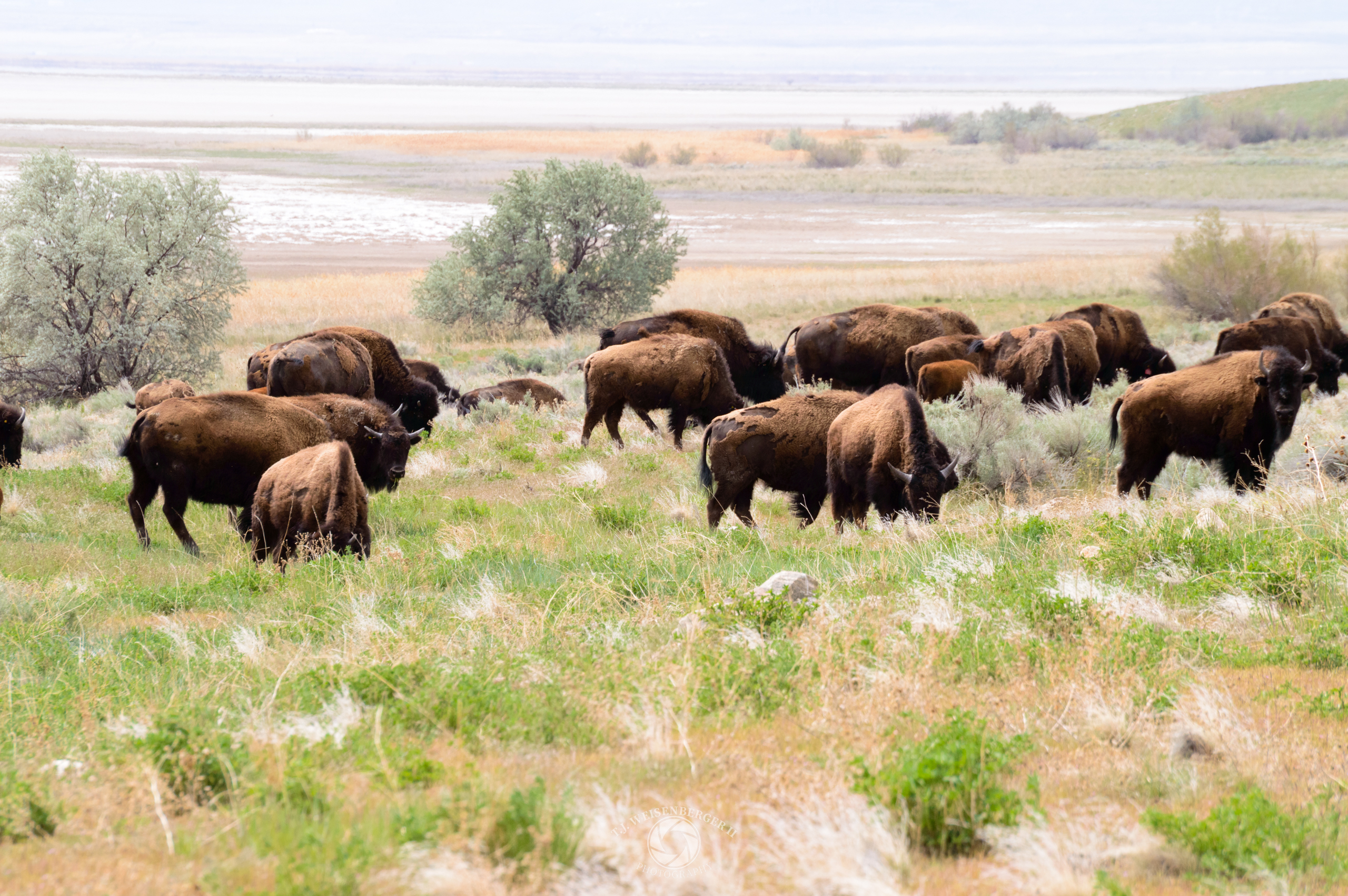 A herd of American bison grazes on the open landscape.