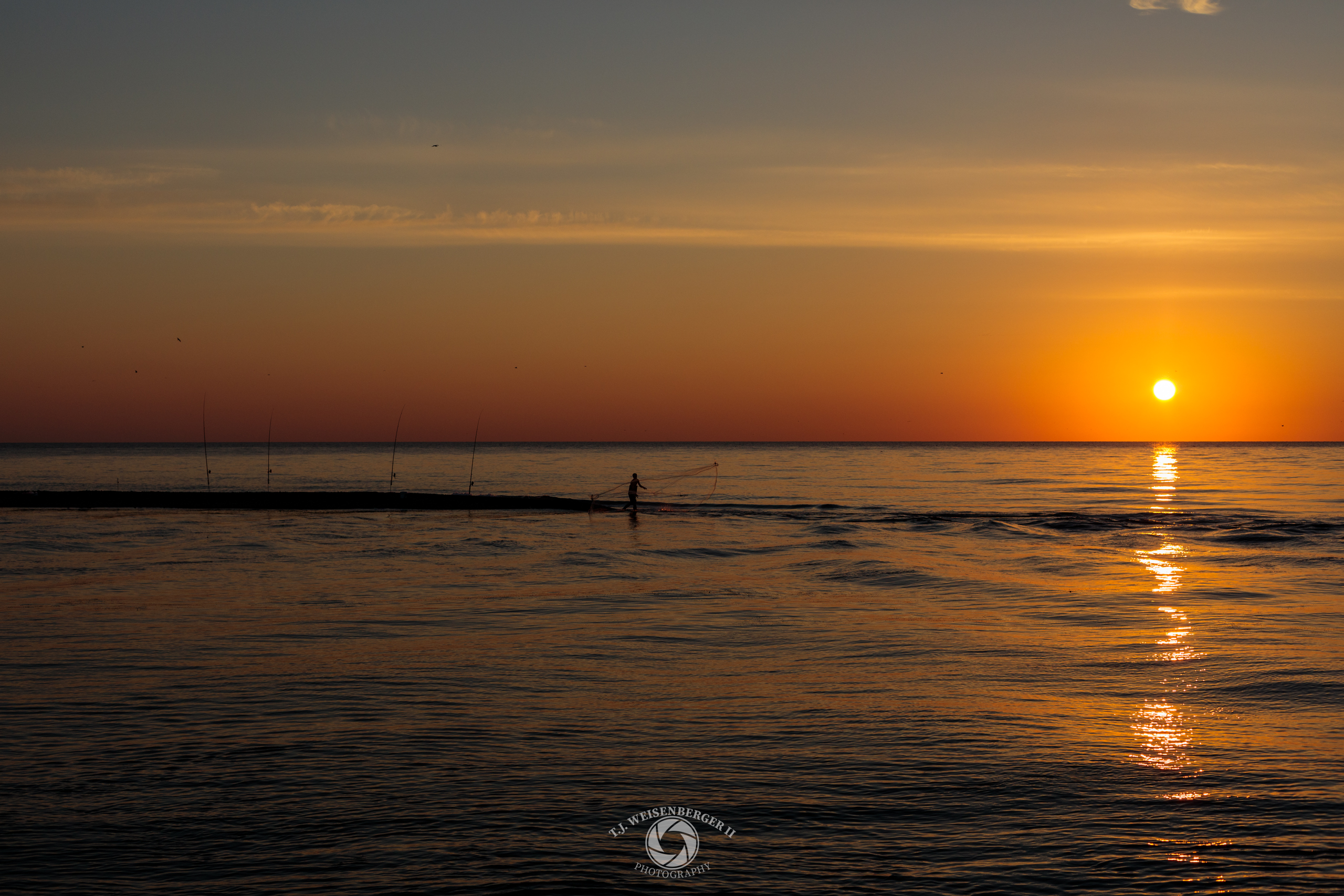 A fisherman casts a net from a sandbar at sunset, while four fishing rods wait quietly for a bite along the Black Sea coast.