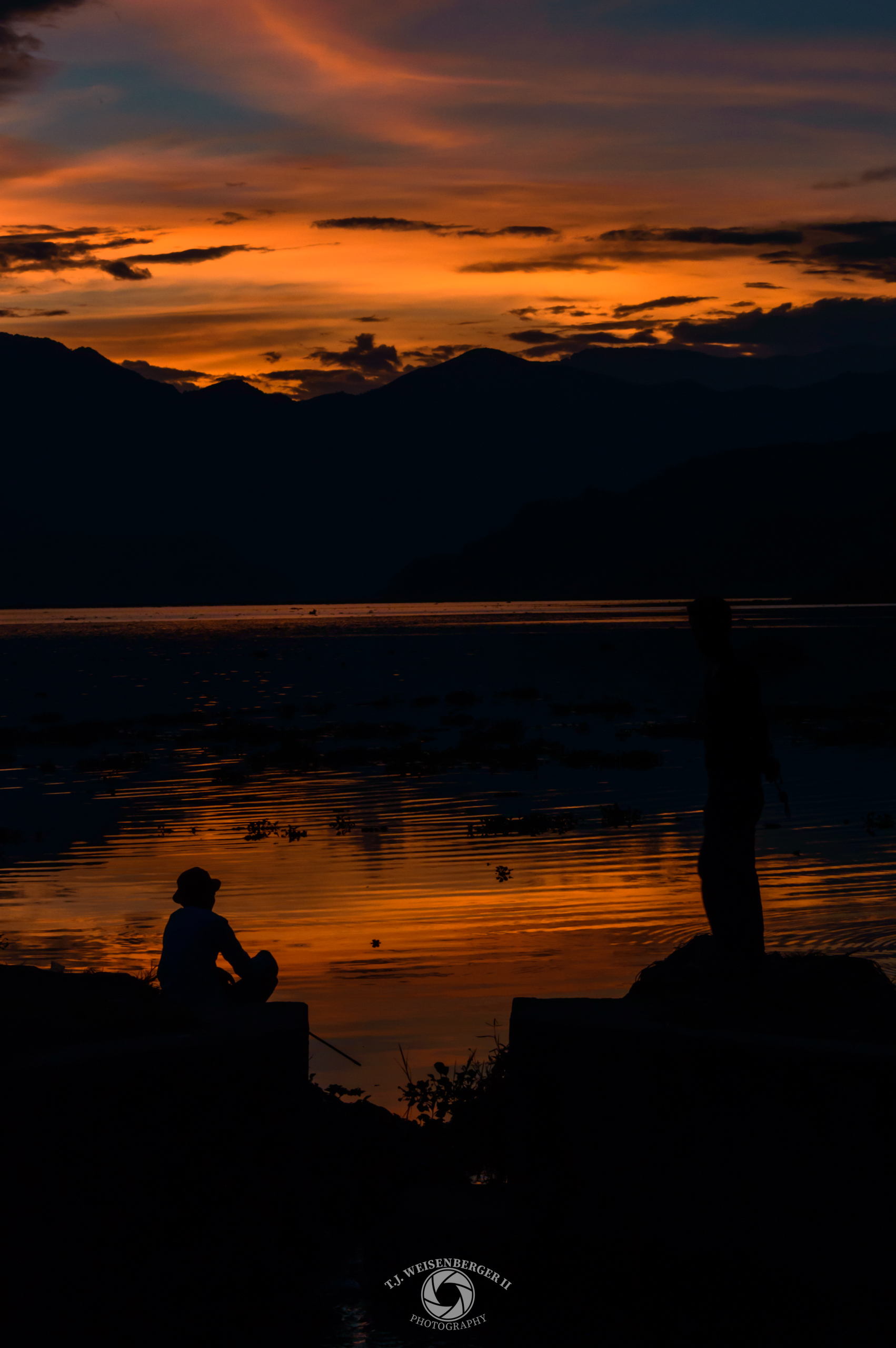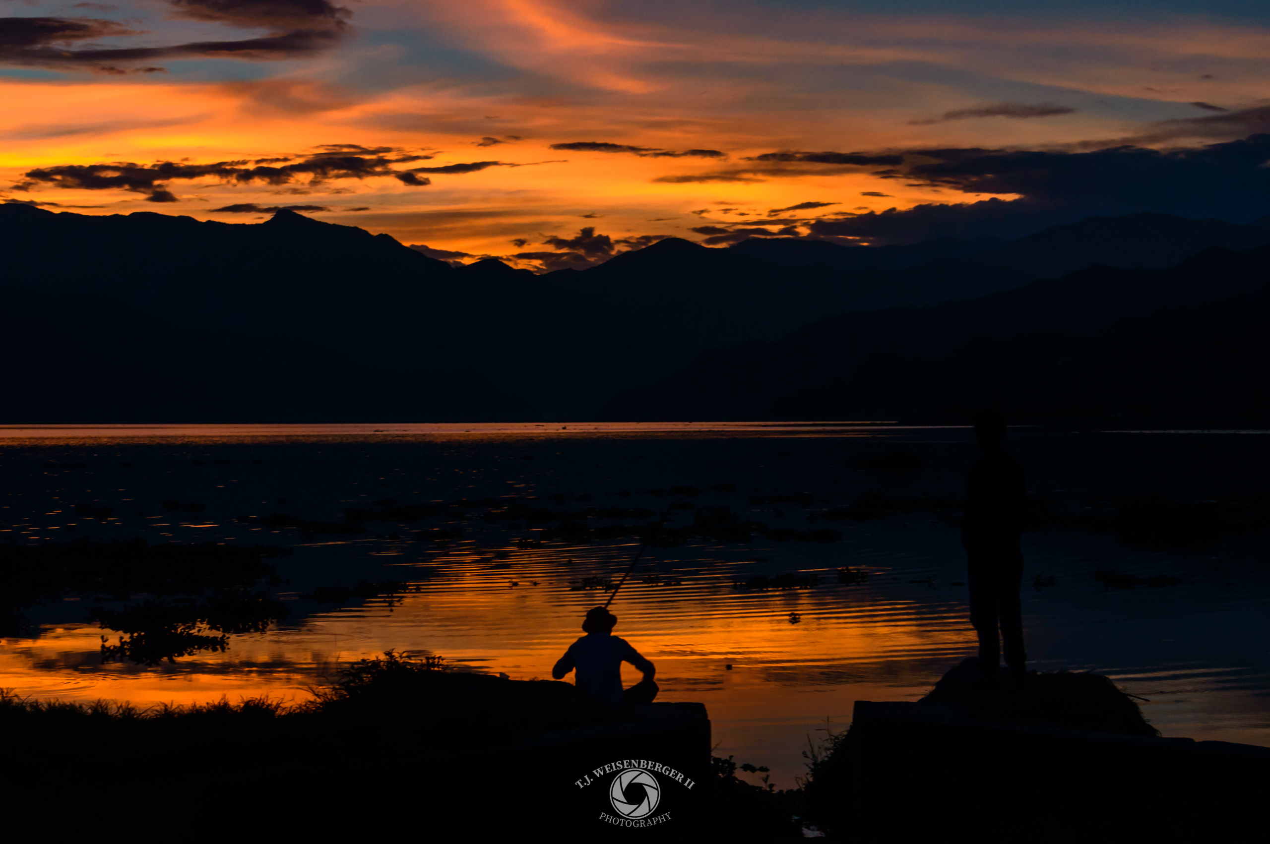 Two fishermen are silhouetted against a glowing sunset as they fish along the shore of the lake.