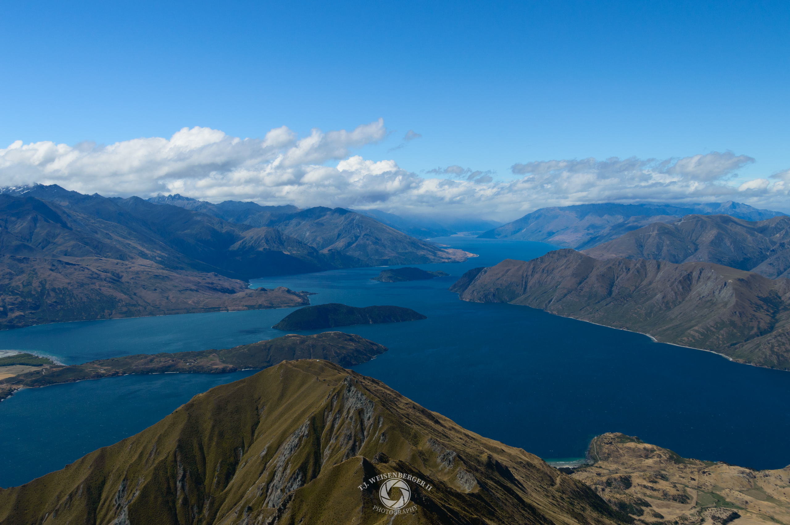 From the summit ridge, Lake Wanaka stretches deep into the Southern Alps, framed by layered mountains and clear alpine light.