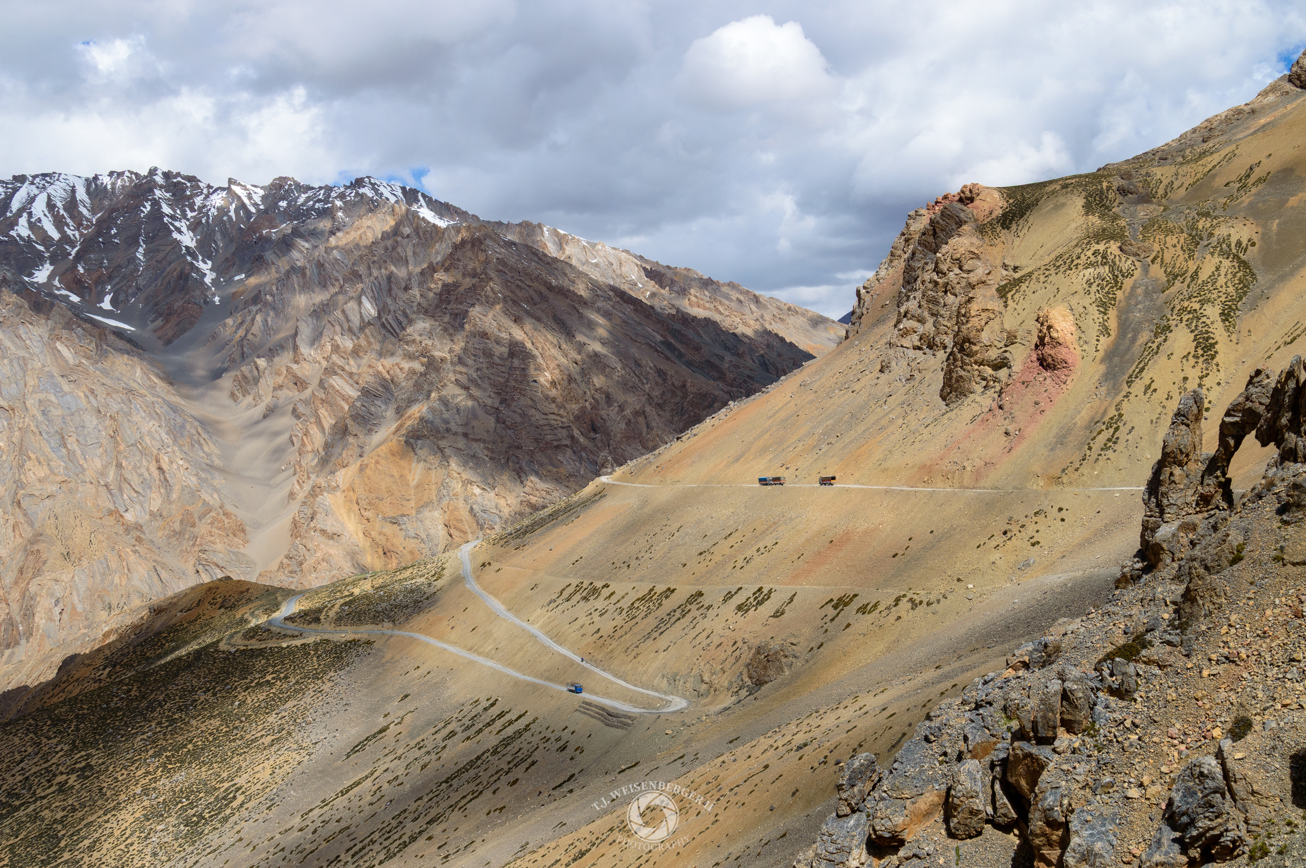 A narrow mountain road winds through the high-altitude desert, carving across barren slopes beneath snow-dusted Himalayan peaks.