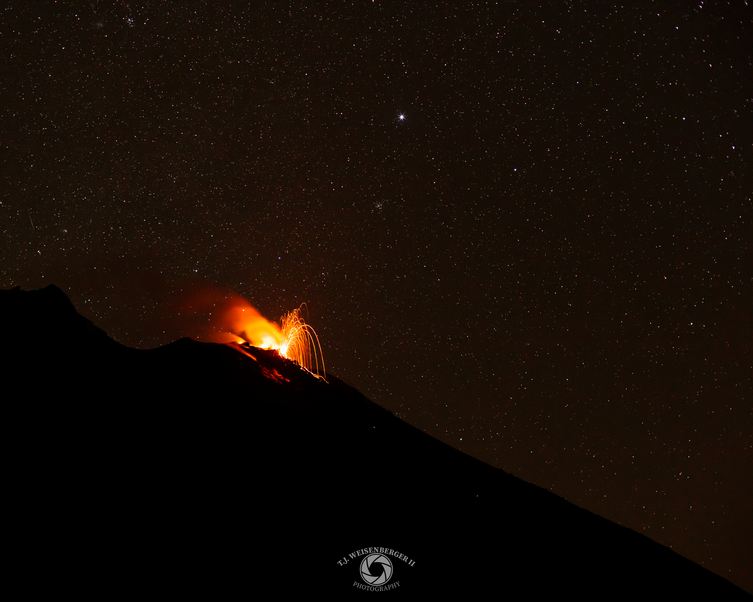 Lava erupts from Stromboli Volcano, illuminating the night sky beneath a canopy of stars.
