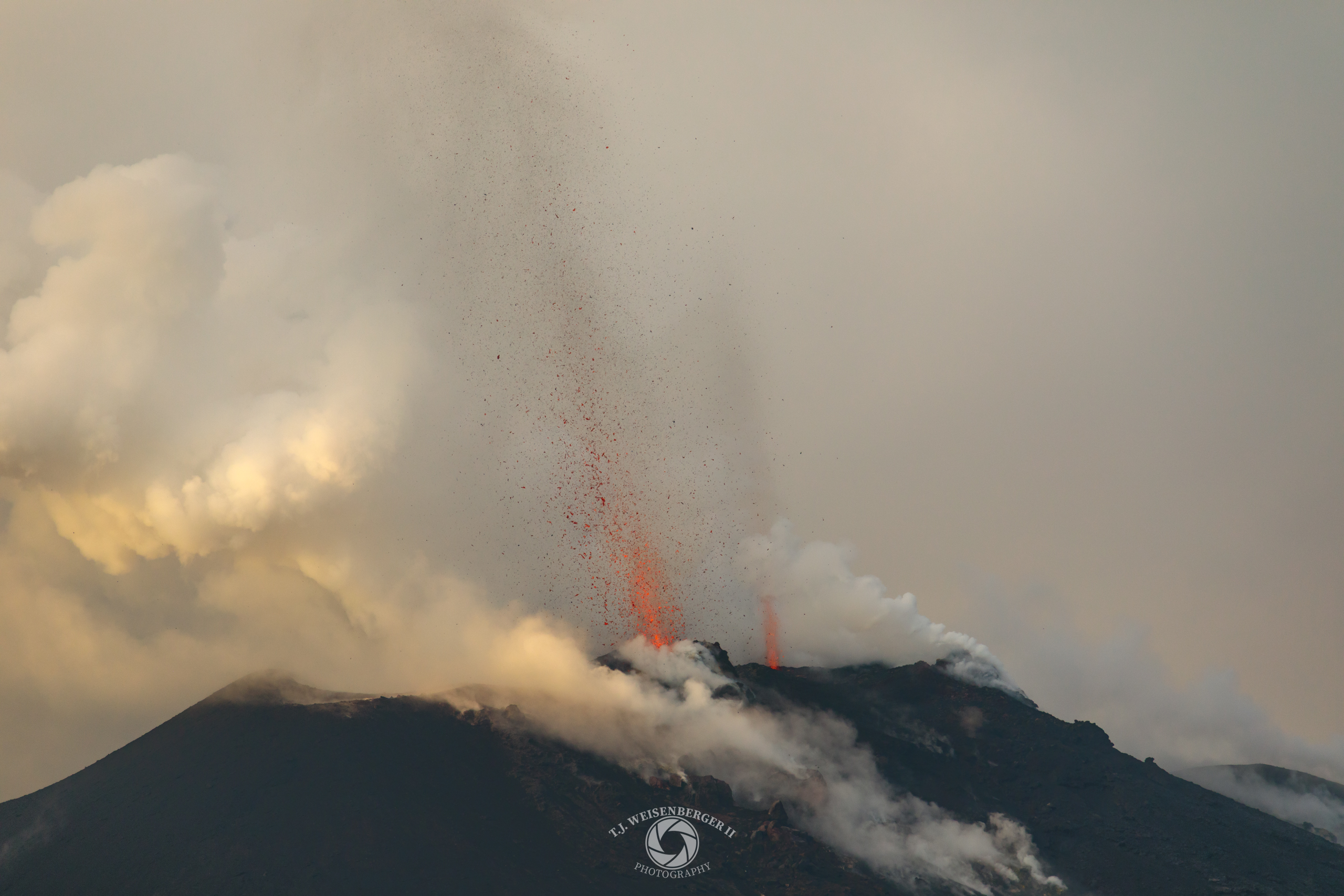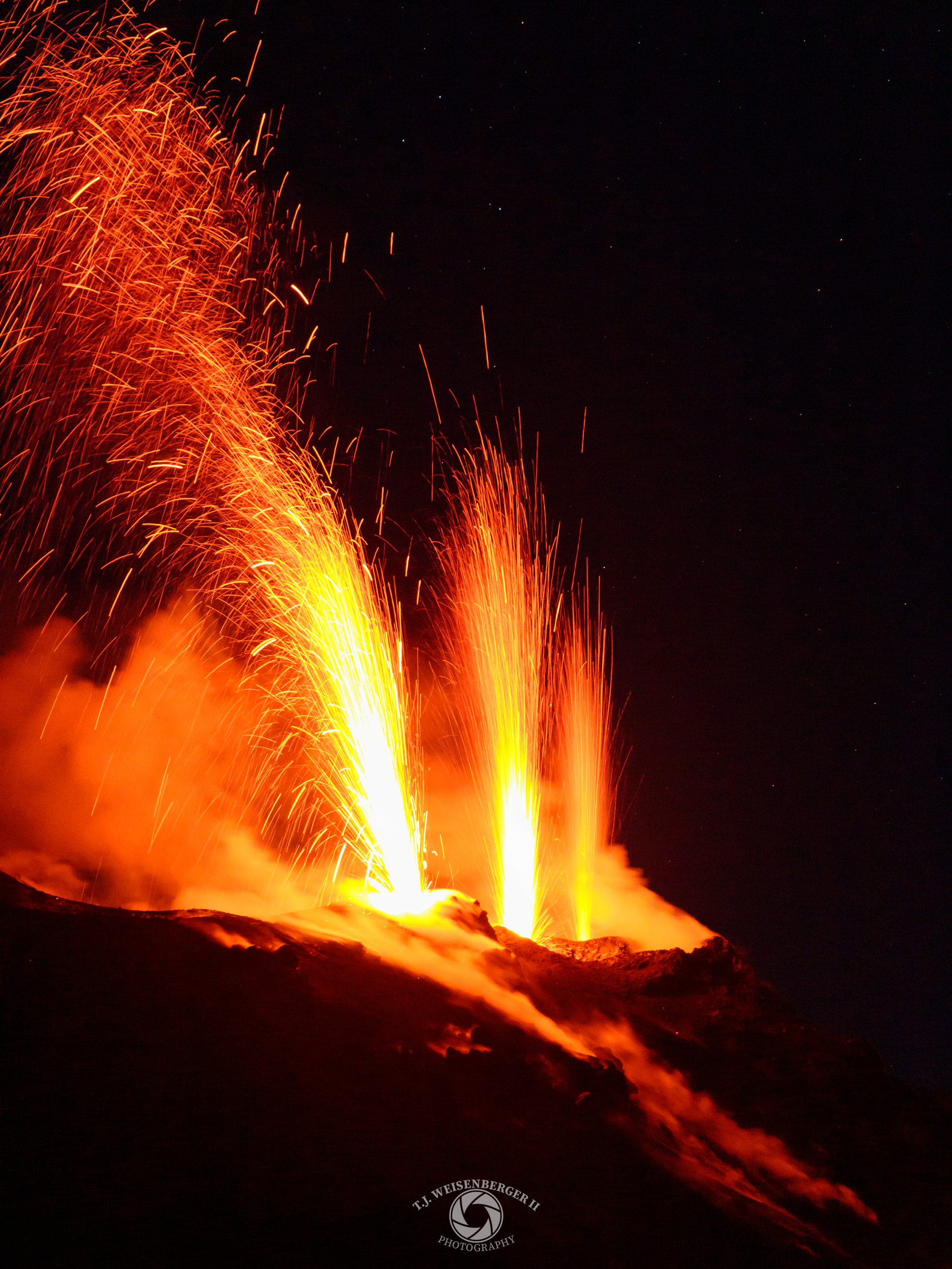 Lava fountains burst from Stromboli Volcano during a nighttime eruption, sending glowing fragments into the air.