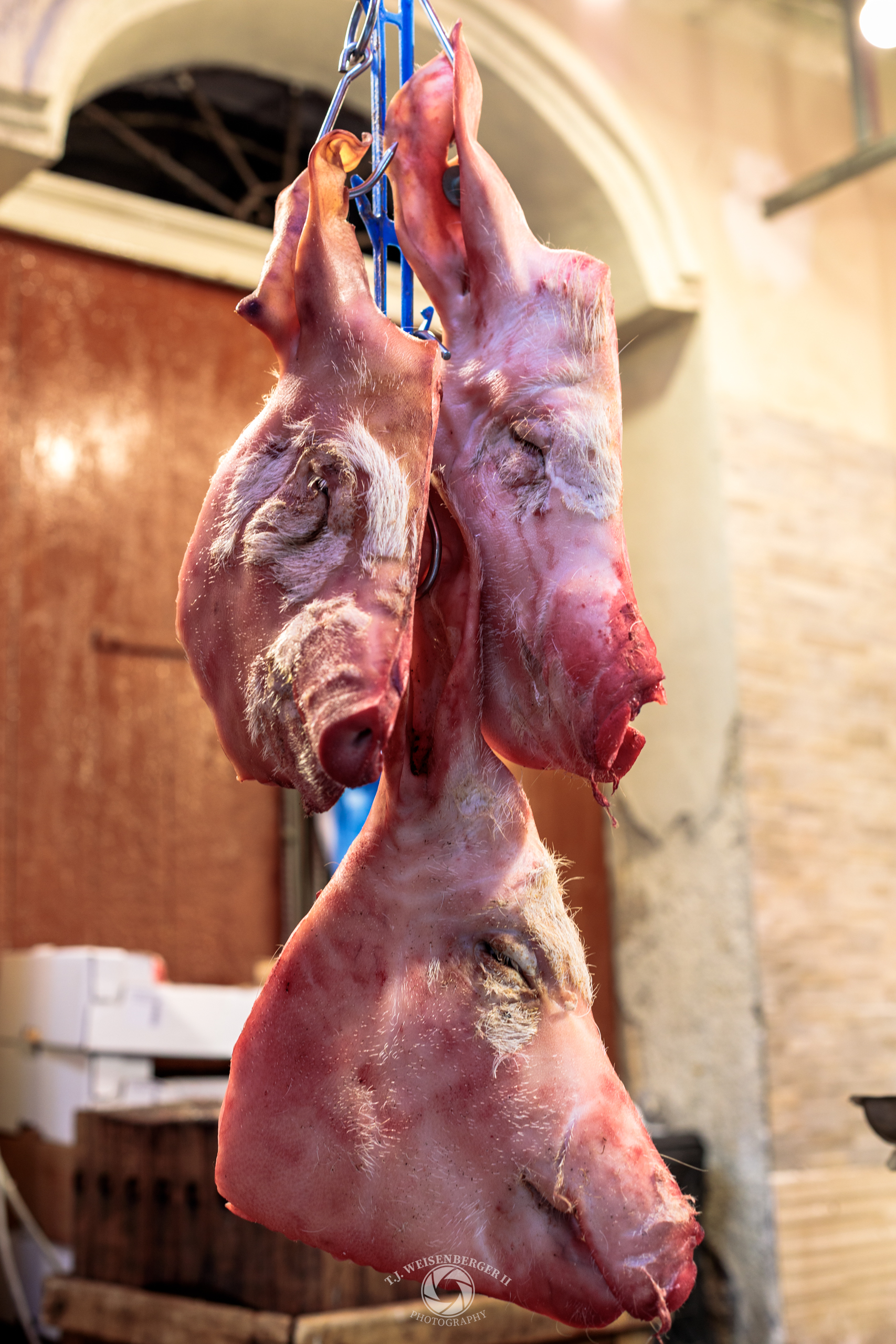 Pig heads hang for sale at a street market, reflecting traditional butchery practices in the city.