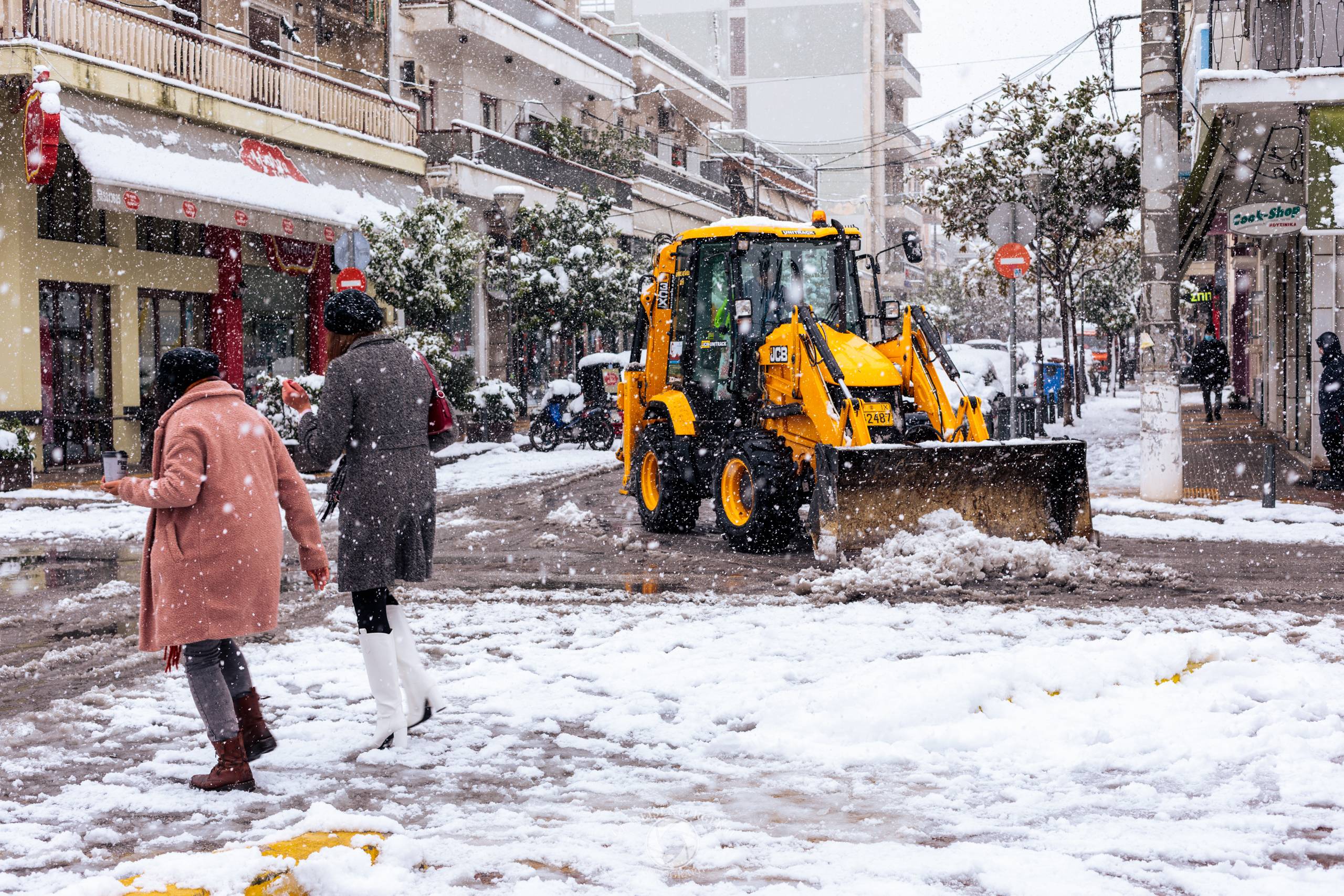 A tractor clears snow from a city street during a rare winter storm.