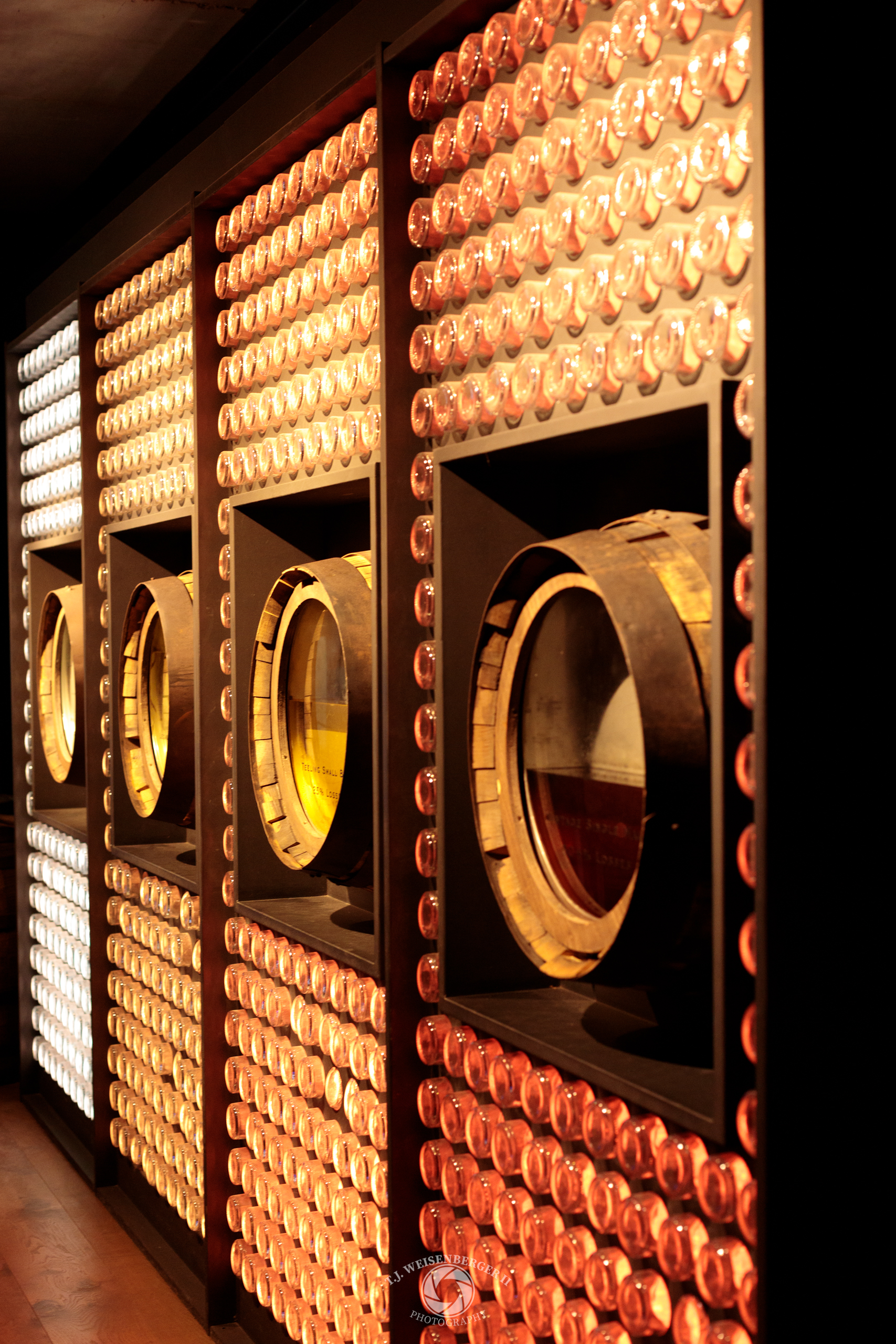 Whiskey of different ages and hues is displayed in barrels set into a wall of backlit bottles.
