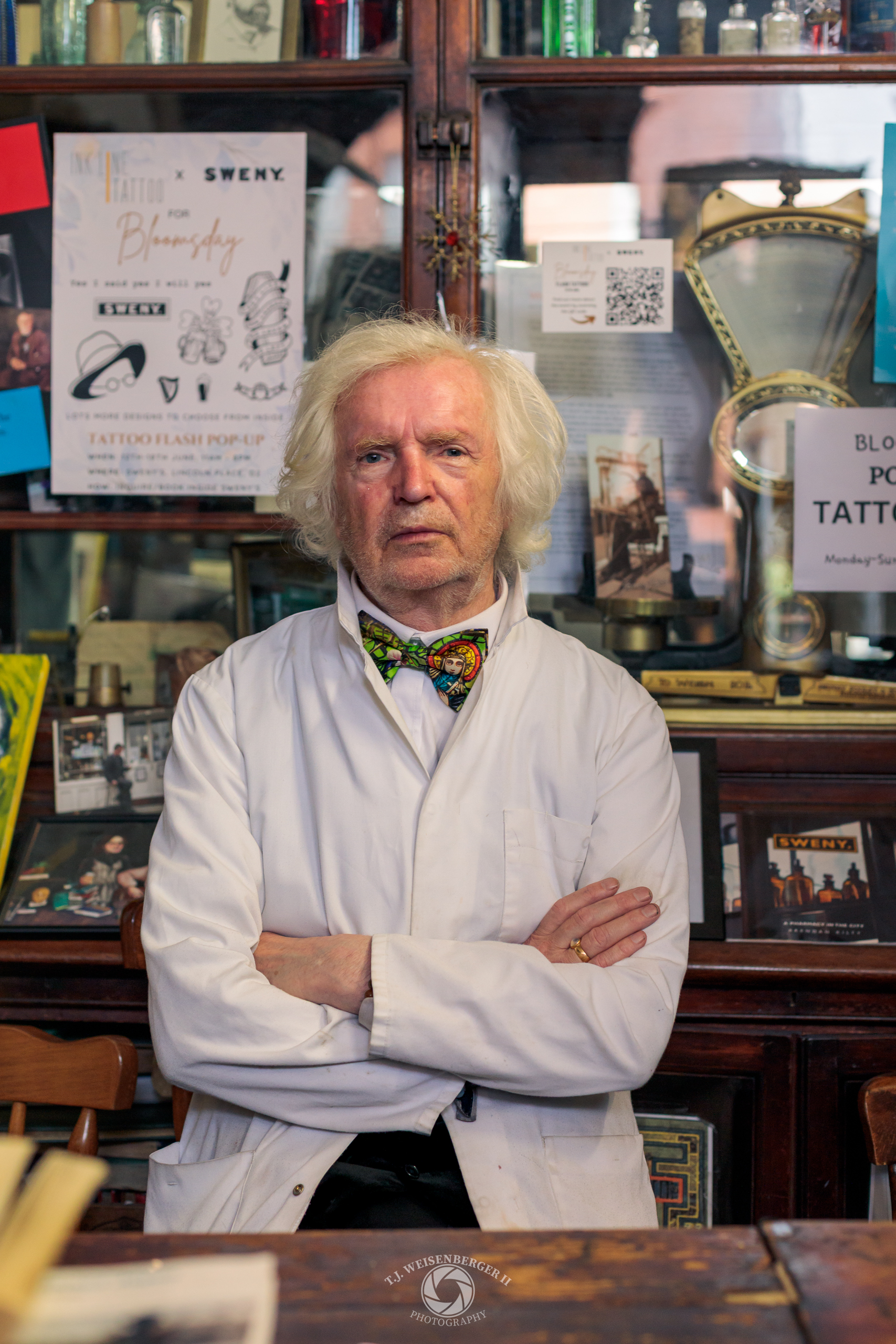 P. J. Murphy poses for a portrait inside the historic Sweny’s Pharmacy, wearing his trademark white lab coat and colorful bow tie.