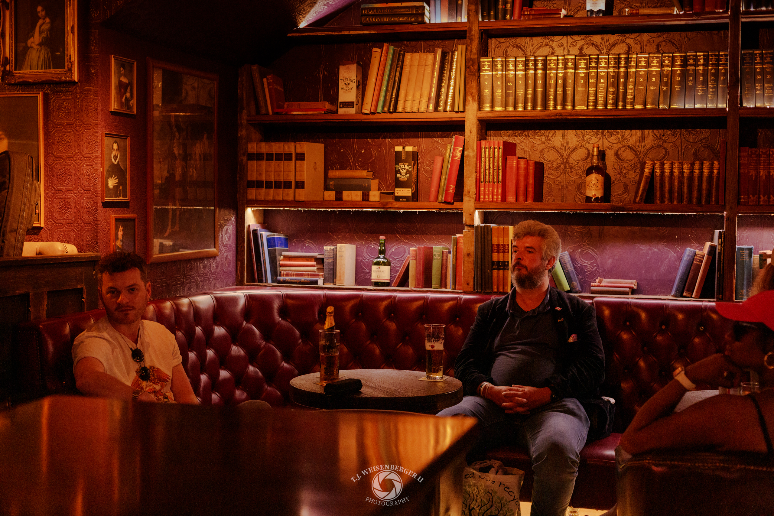Three people listen to live Irish traditional music inside Mulligan & Haines pub.