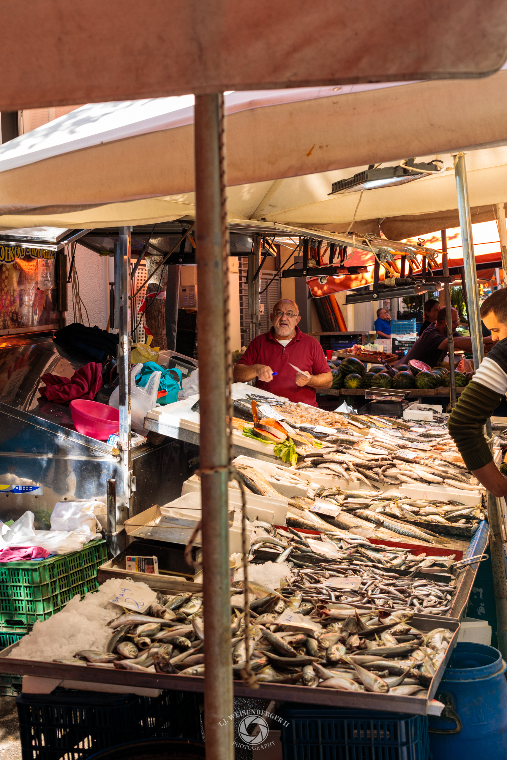 A fishmonger sells the morning’s catch at a laiki market, where vendors line the streets beneath canvas awnings.