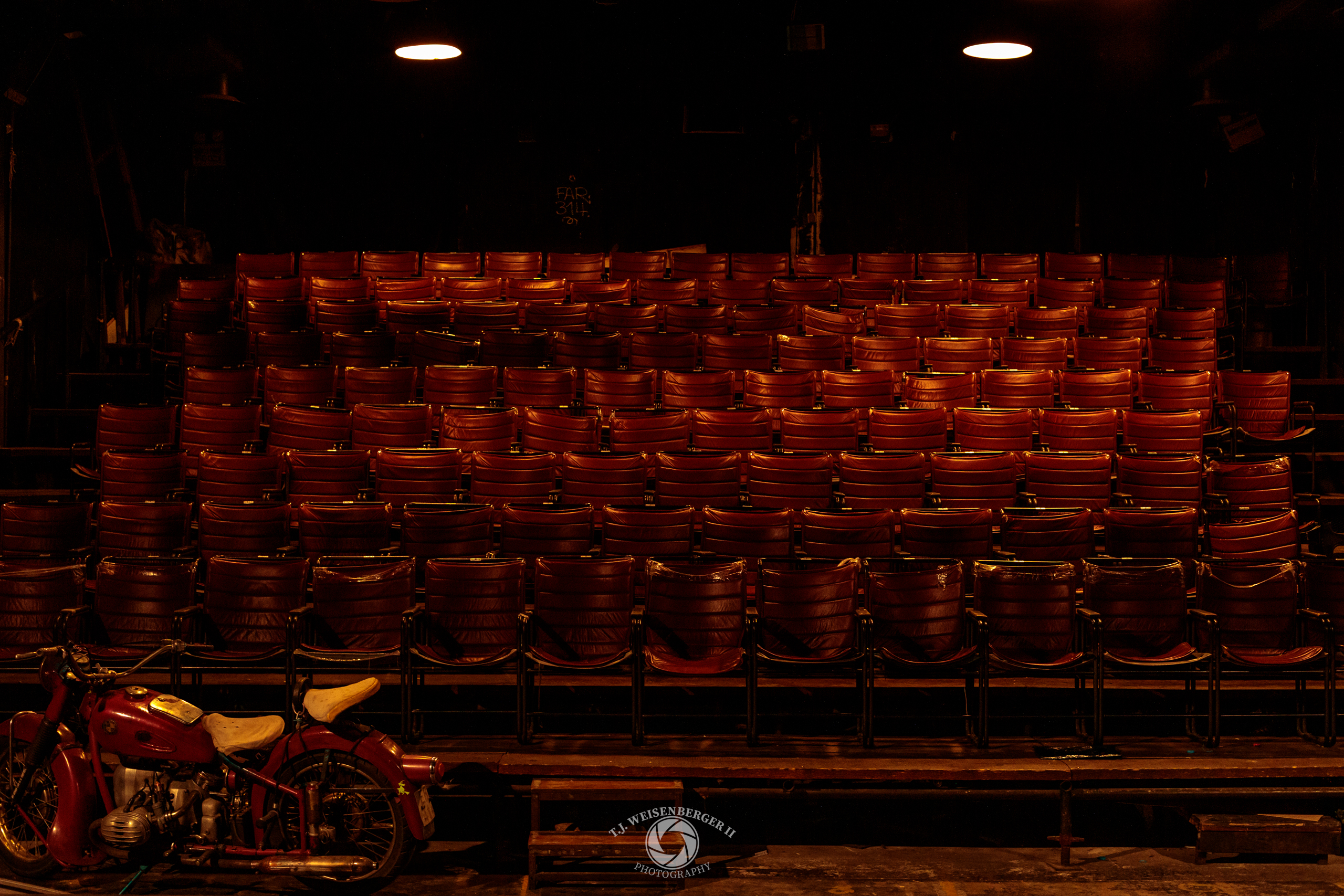Rows of red vinyl seats fill an old theater, softly lit as a vintage motorcycle rests on the stage below.