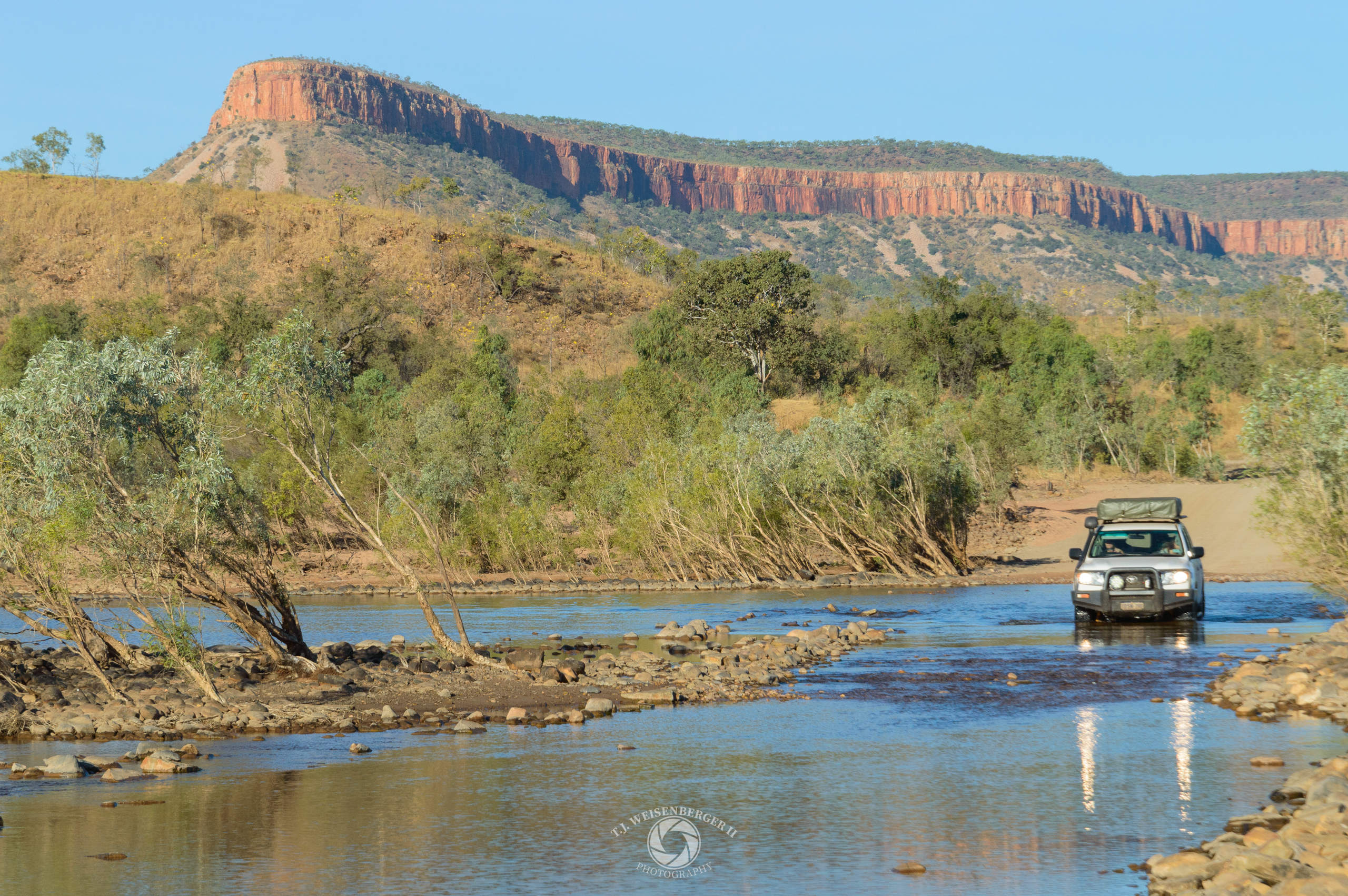 A four-wheel-drive vehicle fords the Gibb River in the remote Kimberley region.