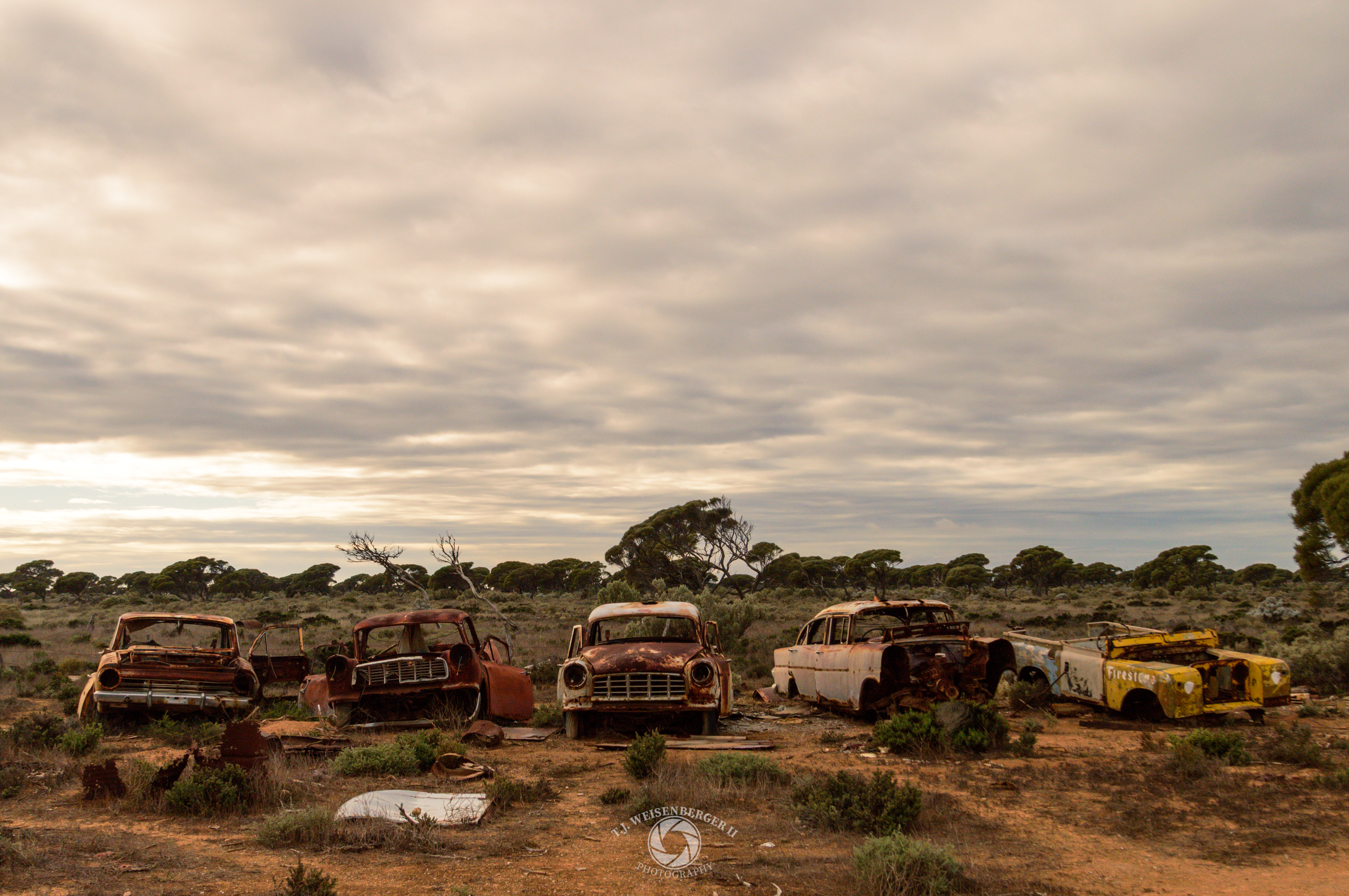 Rusting vehicles are left behind at a remote homestead, slowly reclaimed by the harsh conditions of the Nullarbor.