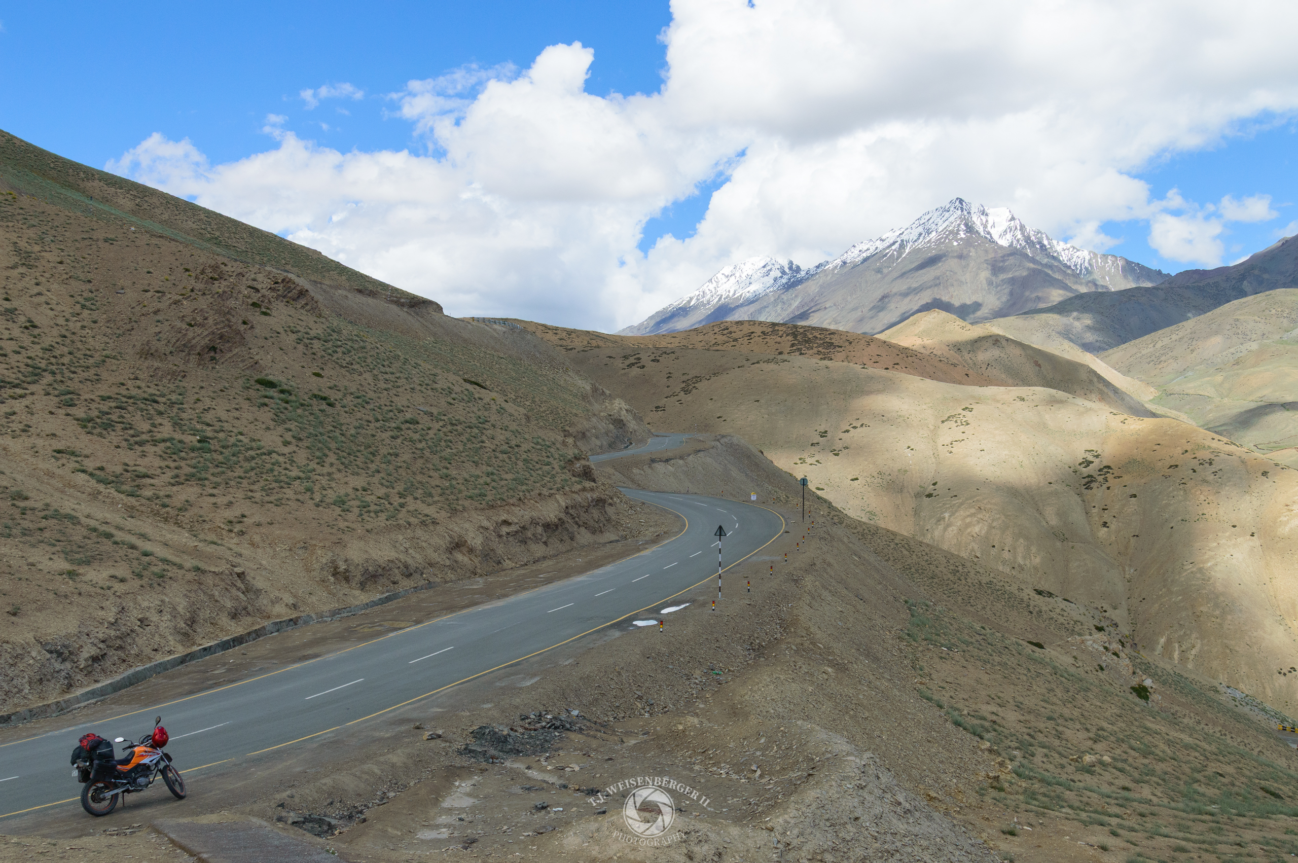 A rare stretch of paved road leads toward Leh, winding through the stark landscape of the high Himalayas.