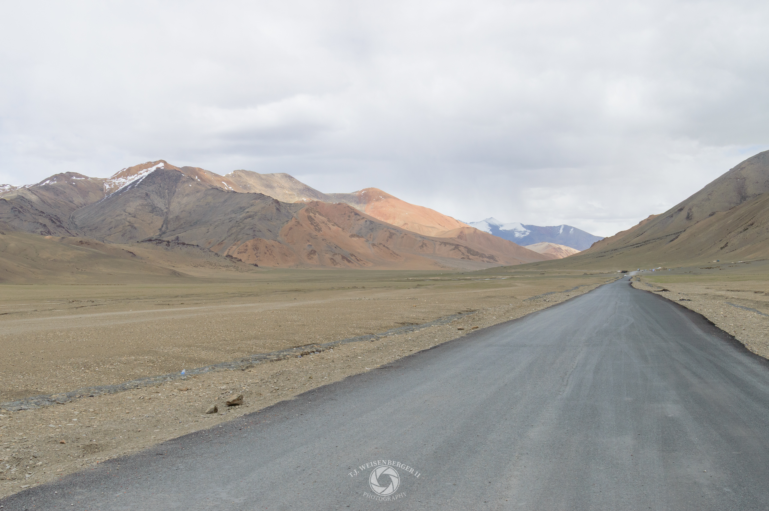 A rare straight stretch of paved road leads toward Leh, cutting through the vast Himalayan plateau.