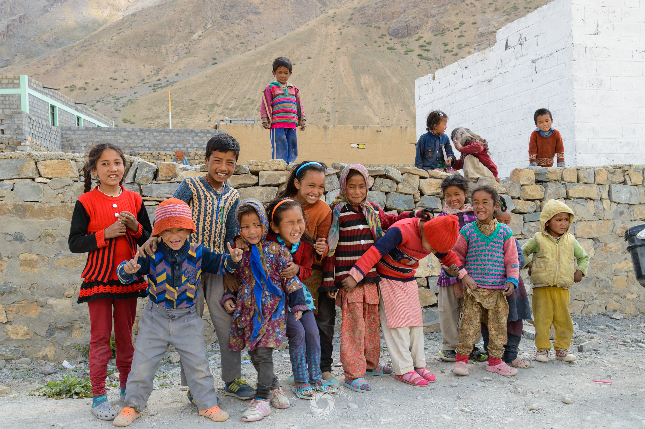 Schoolchildren run out to greet me, laughing and posing together in a remote Himalayan village.