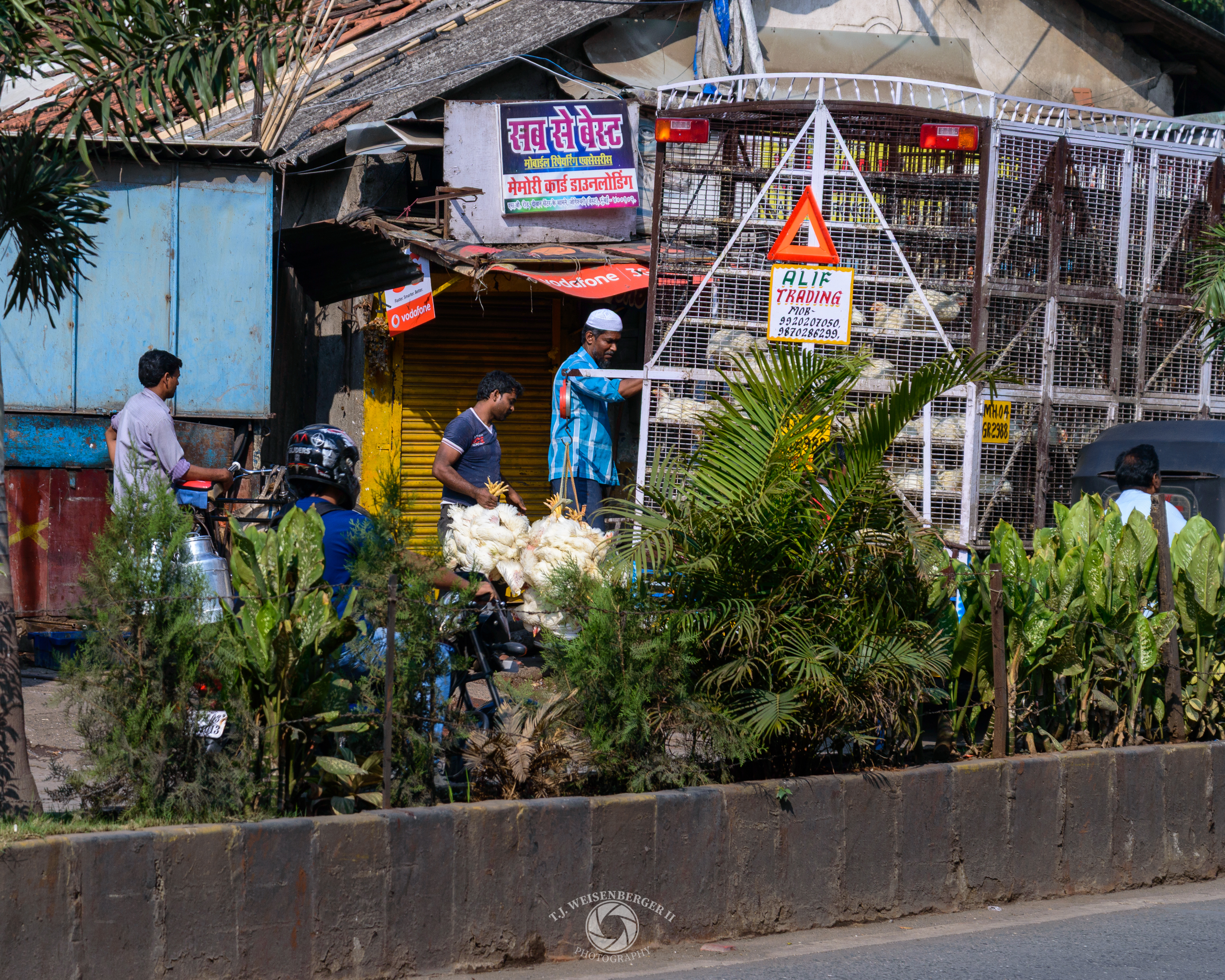 A truck sells live chickens on a city street, reflecting the everyday rhythms of urban life.