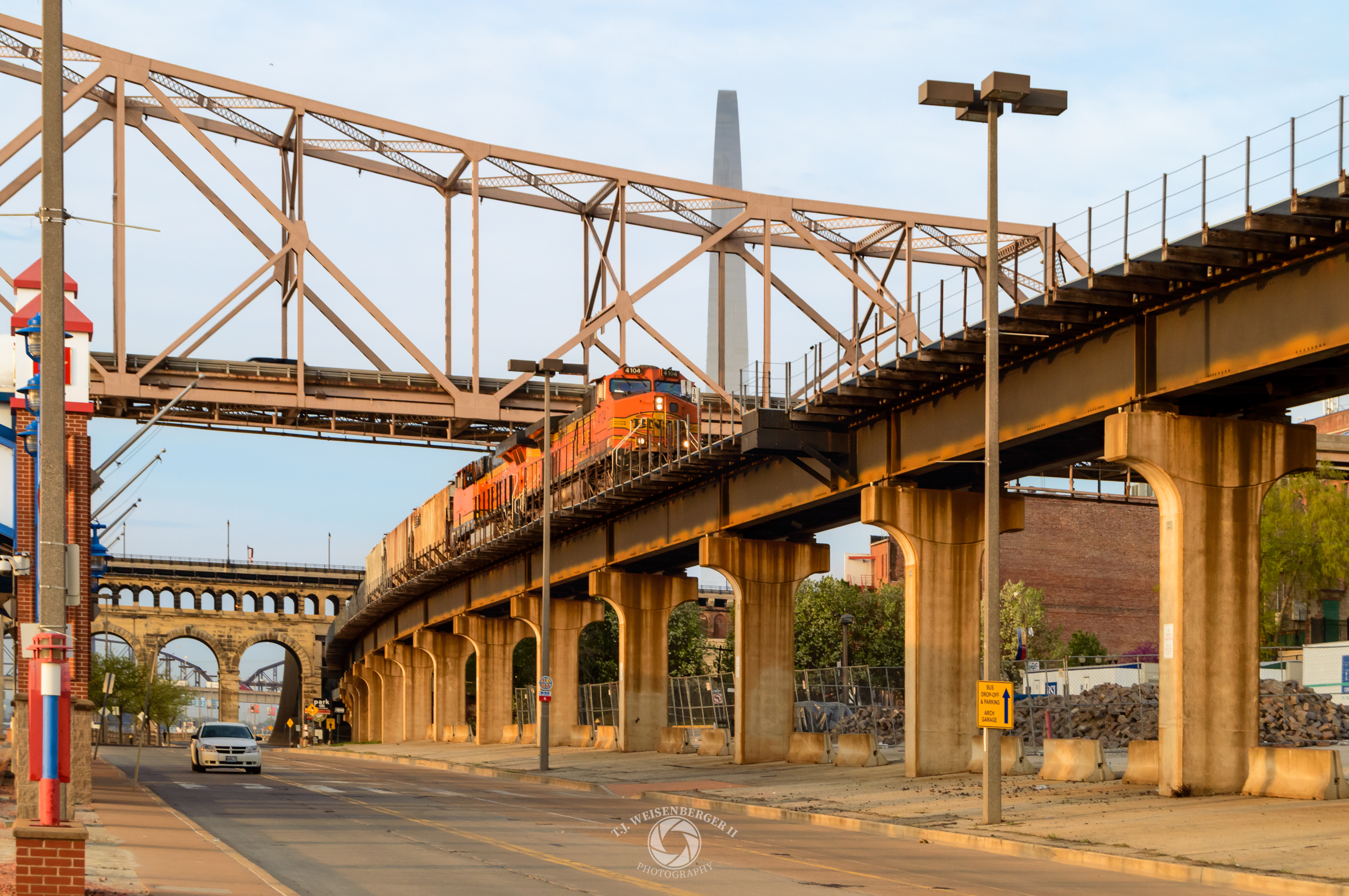 At sunrise, a train passes the Jefferson Expansion Memorial along the riverfront.