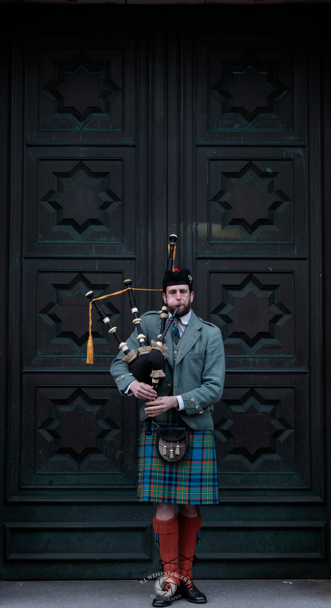 A bagpiper performs in traditional Highland dress before a set of ornate wooden doors, a familiar presence in the historic streets of Scotland’s capital.