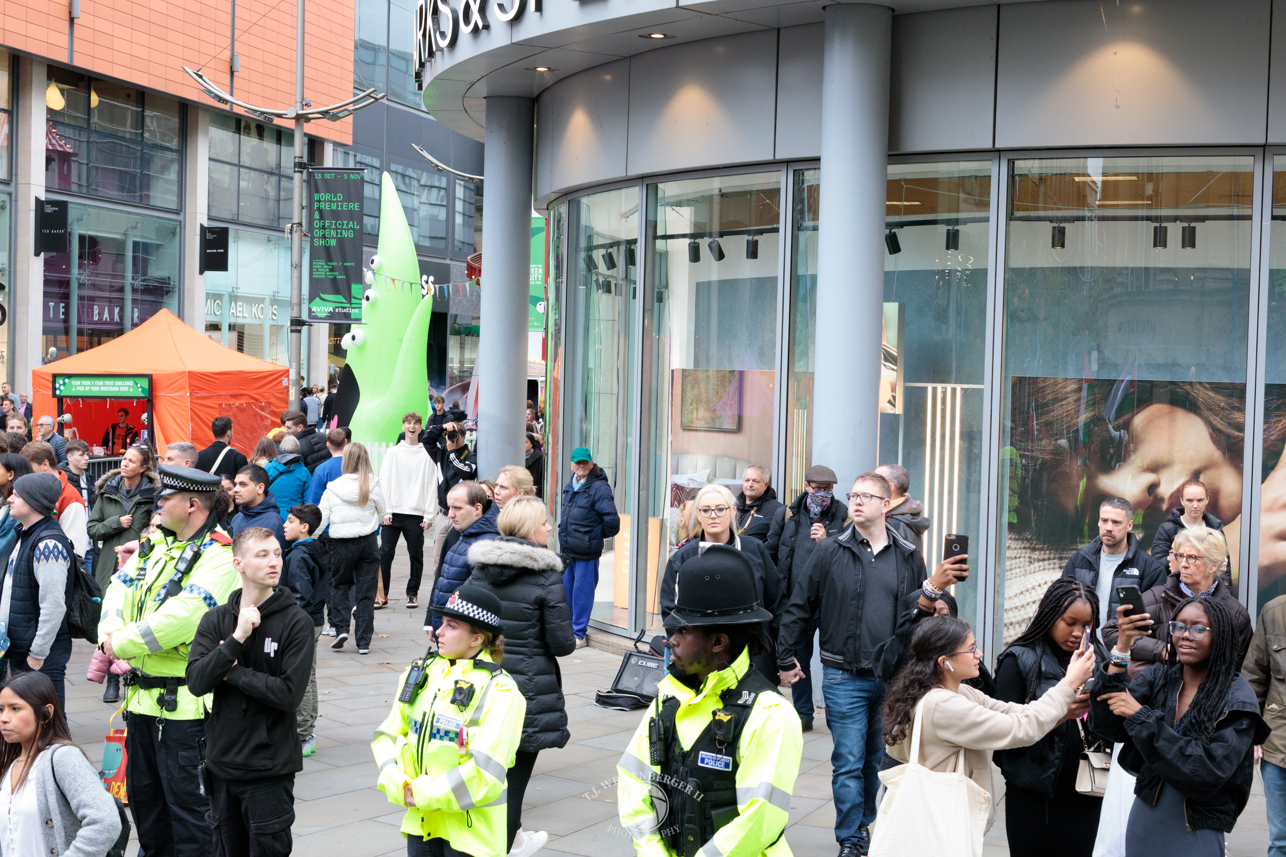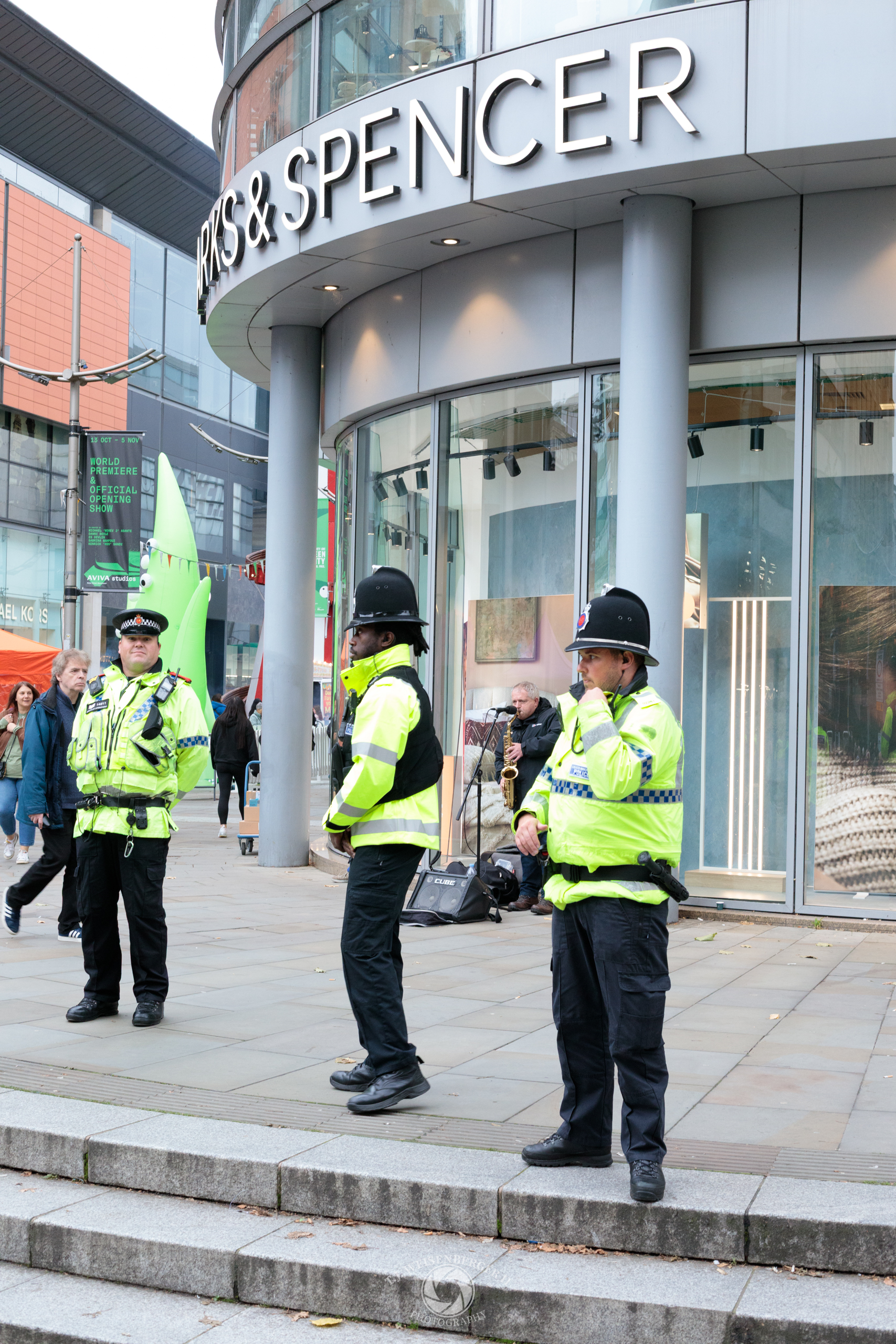 Police monitor a peaceful protest outside a city-center storefront, as pedestrians pass through central Manchester.