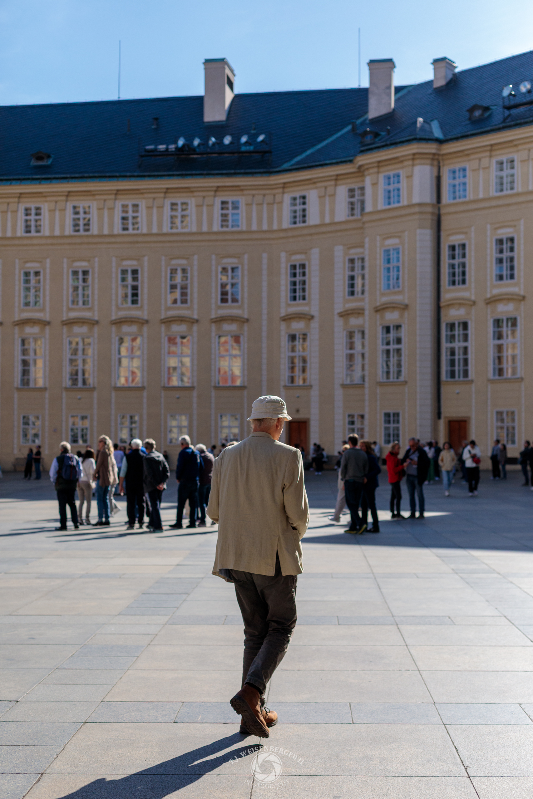 An elderly man in a beige hat and sports coat blends into the courtyard of Prague Castle.