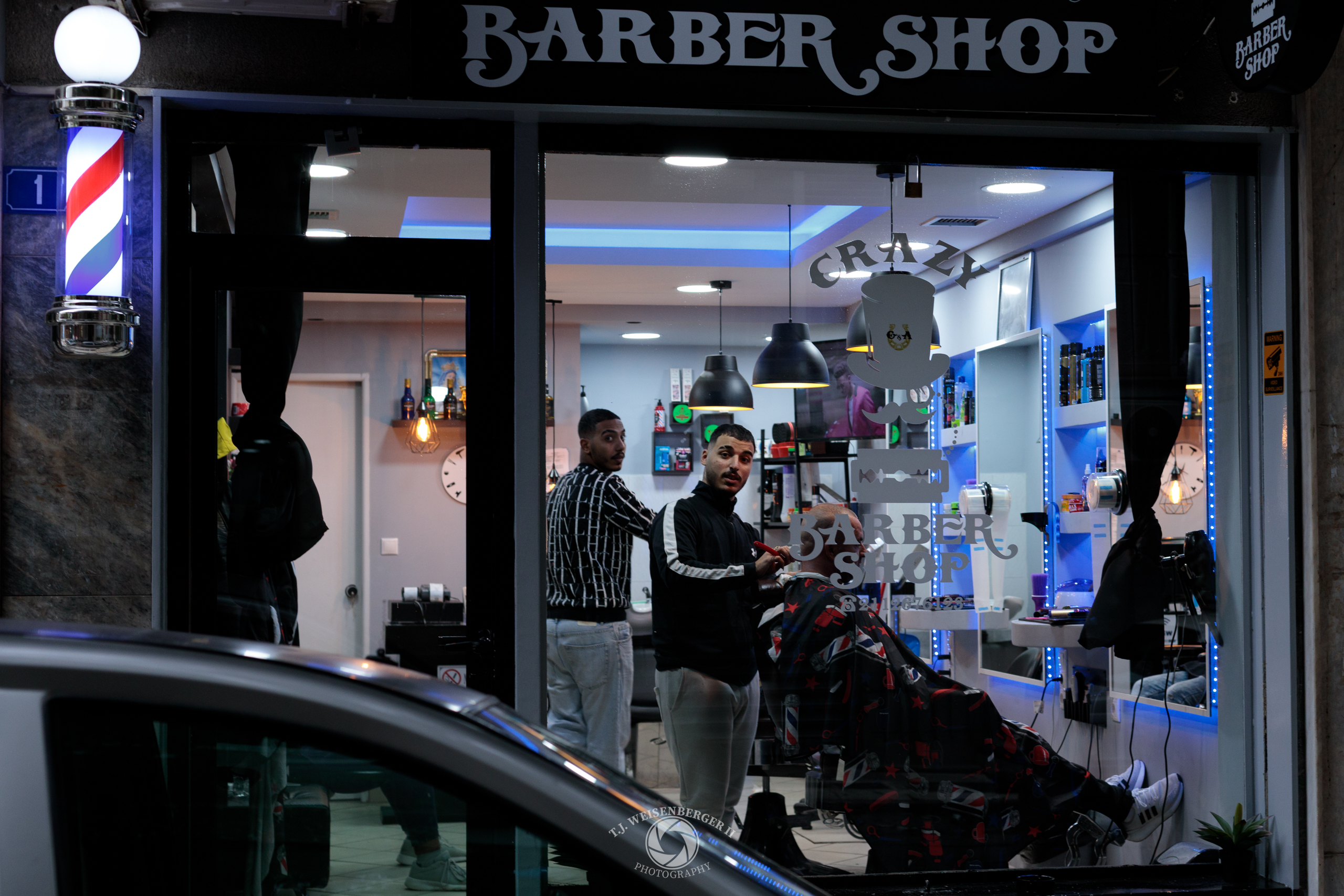 Two barbers glance toward the street from inside a neighborhood barbershop, offering a brief glimpse into everyday life in Athens.