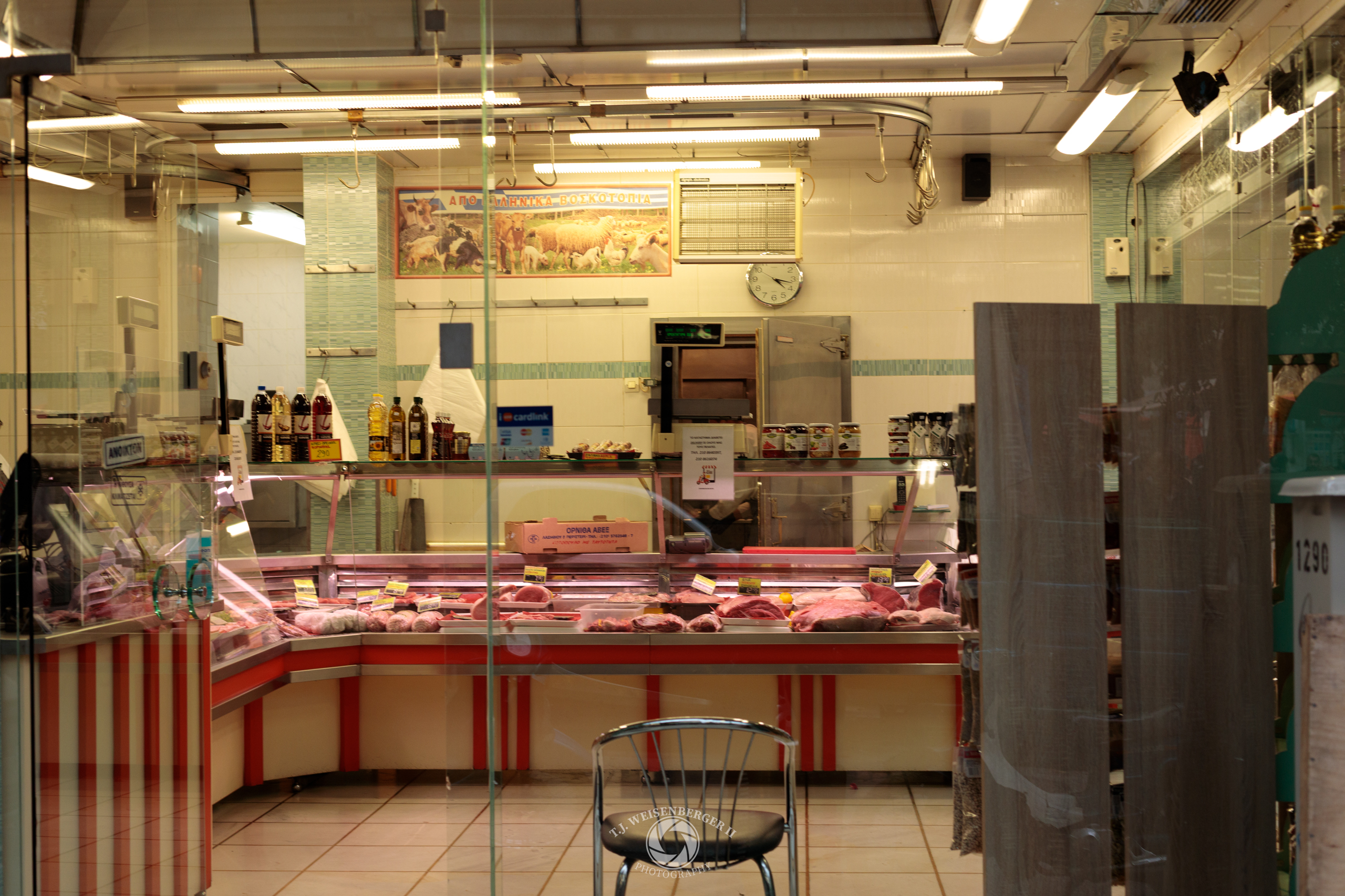 A butcher prepares meat behind a glass counter in a neighborhood shop, part of the everyday food economy along an Athenian street.