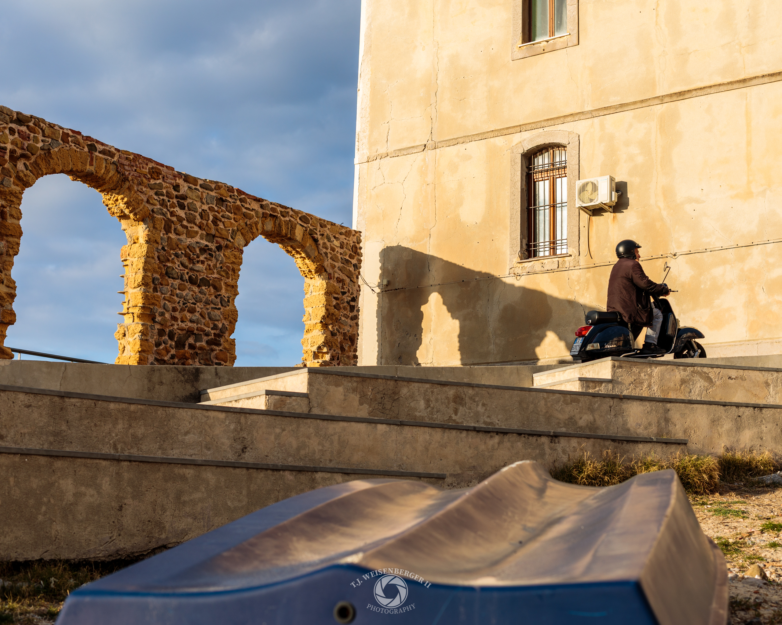 A scooter moves along the waterfront, where warm light, stone arches, and historic walls frame a quiet moment in the coastal town of Cefalù.