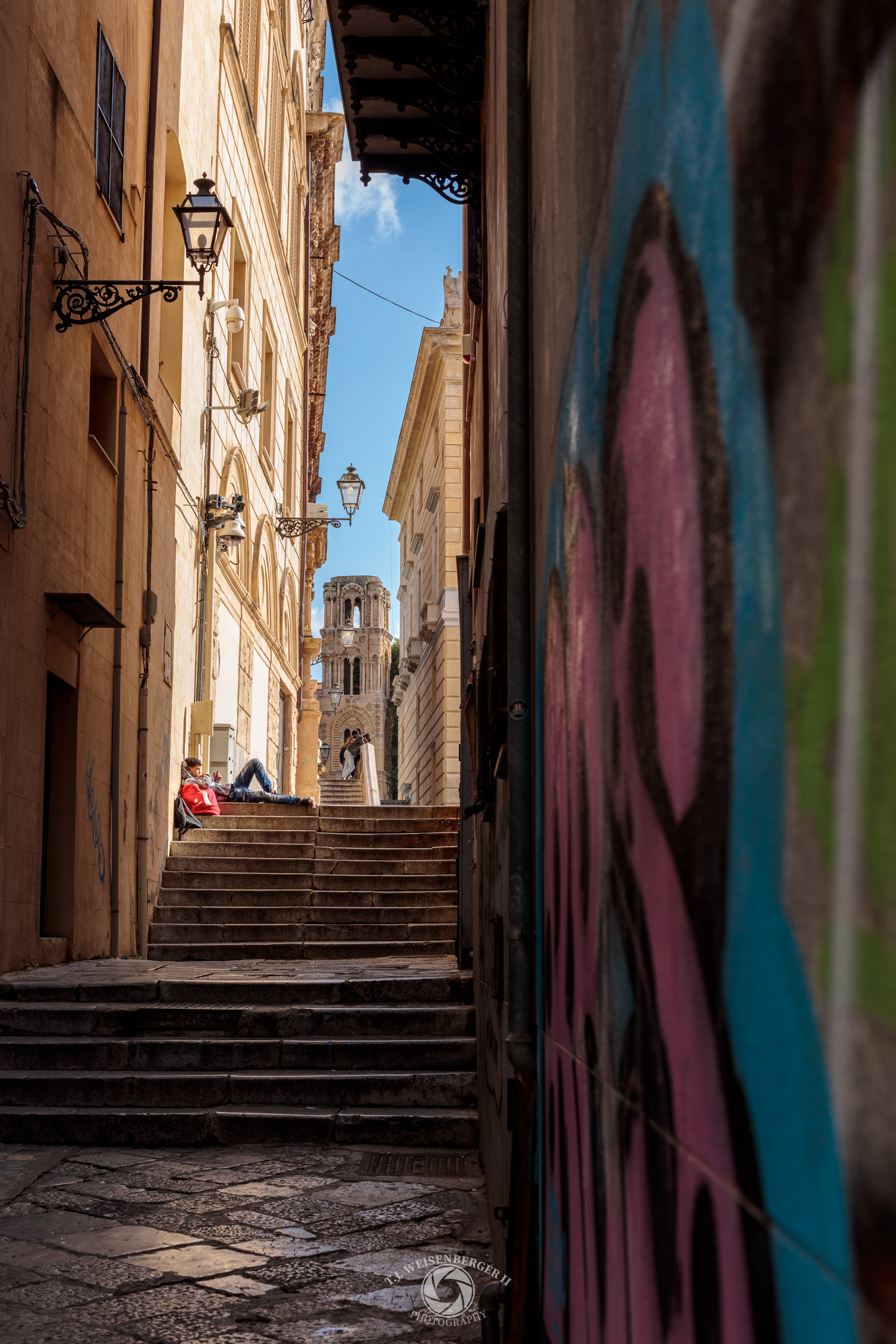 An alleyway climbs beside the Fontana Pretoria, where worn stone steps, layered architecture, and quiet moments of rest define the historic center of Palermo.