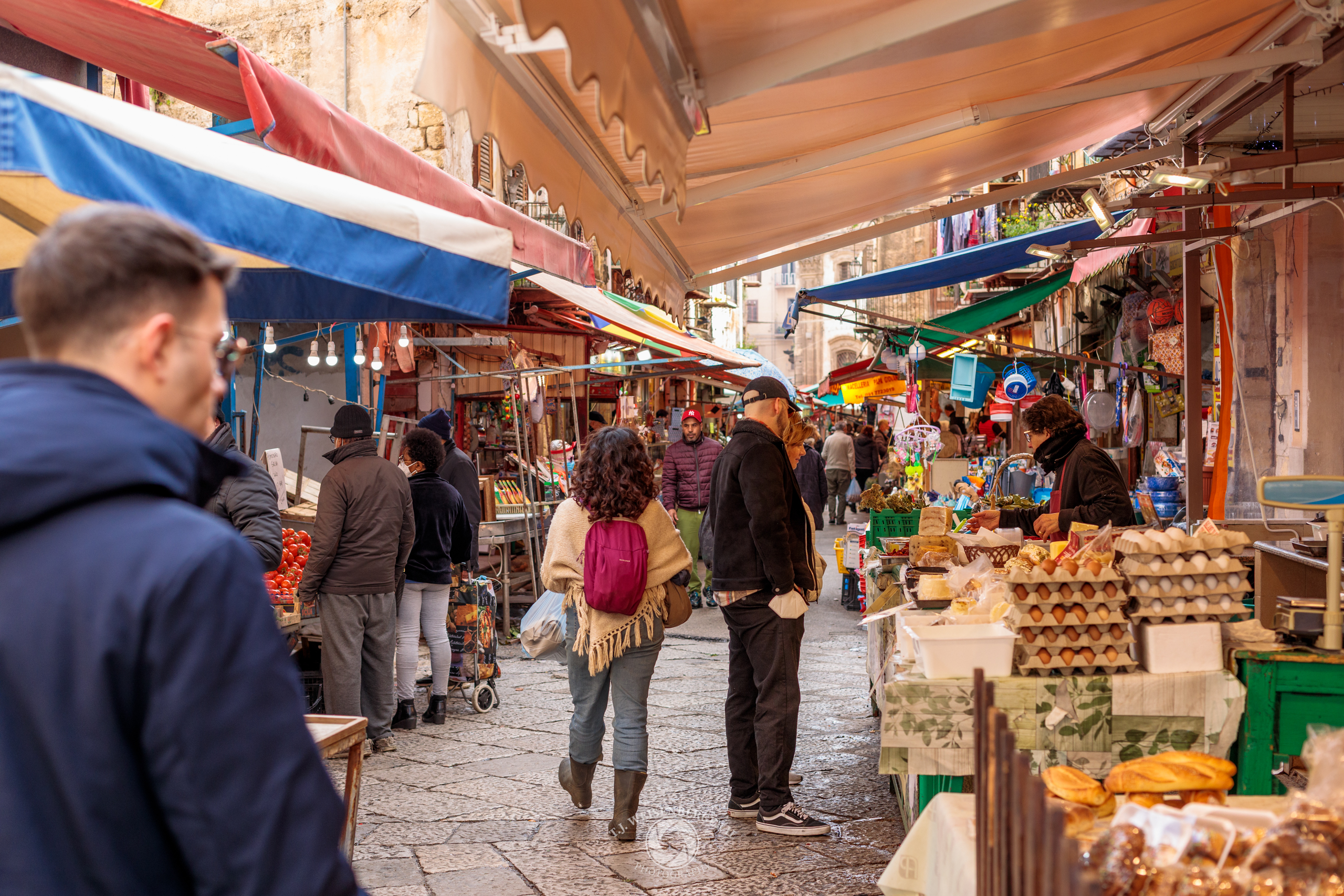 People move through a covered street market, where tightly packed stalls and everyday exchanges animate the historic streets of Palermo.