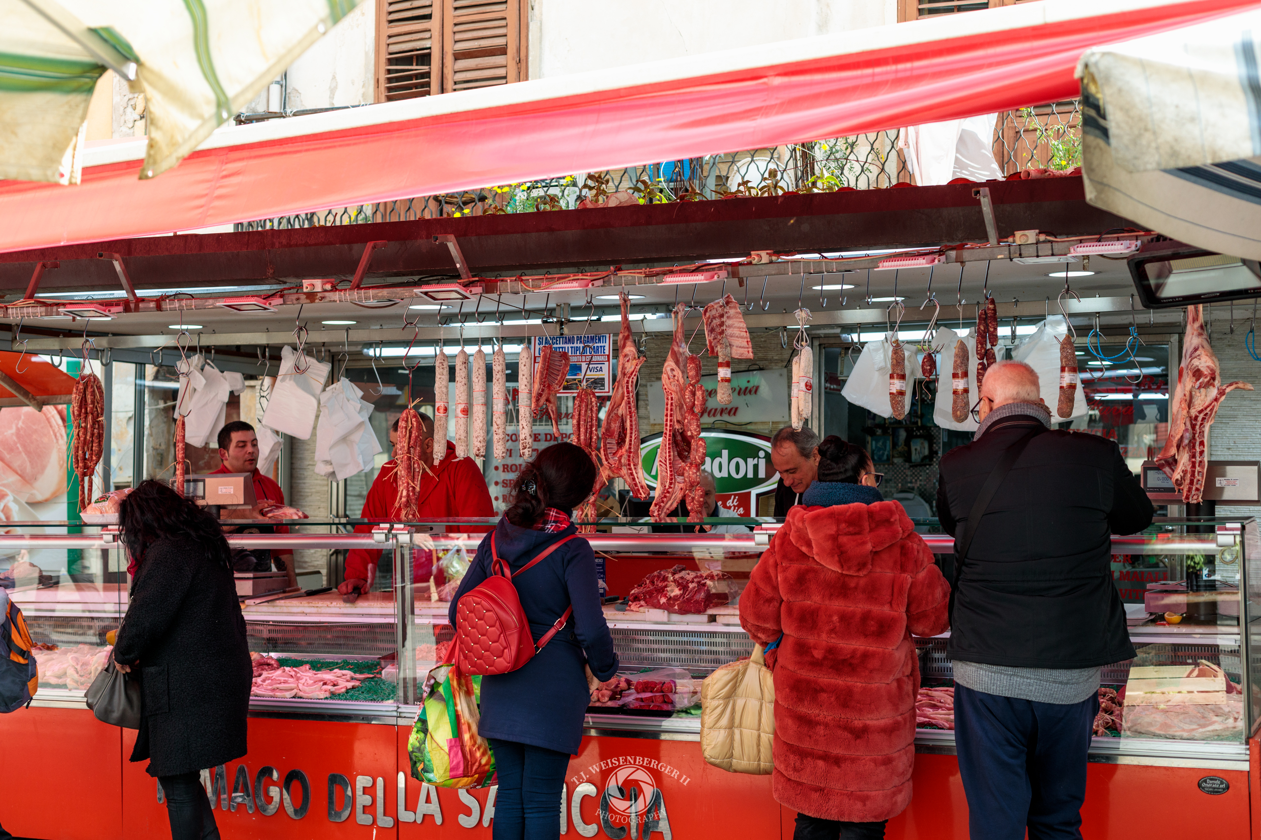 A macelleria sells meat at a street market, with hanging cuts and glass counters forming part of Palermo’s daily food trade.