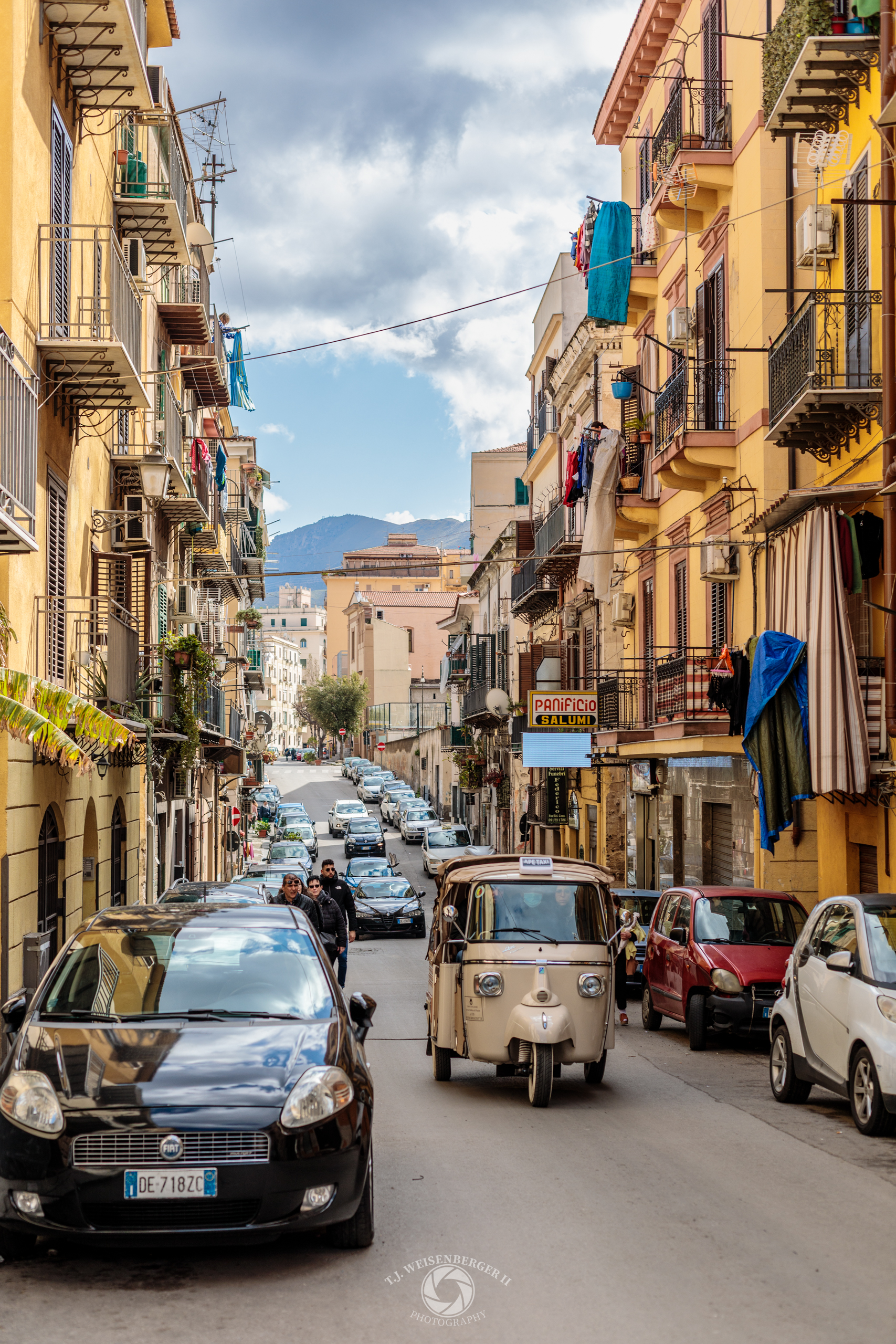 A beige tuk-tuk moves through a narrow street framed by closely spaced buildings and balconies, reflecting the everyday flow of traffic in Palermo’s historic center.
