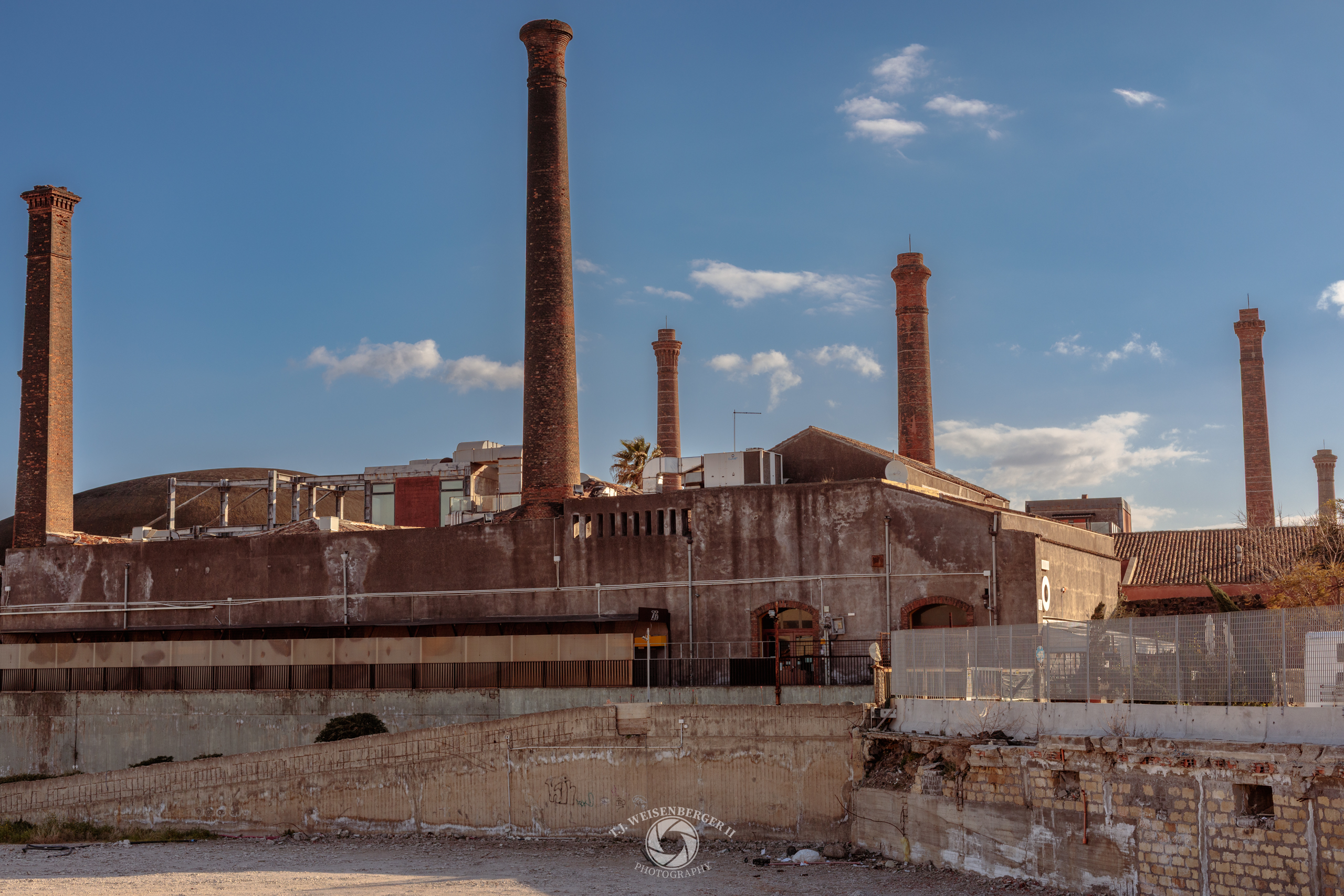 An abandoned industrial site with towering smokestacks sits on the edge of the city, reflecting Catania’s industrial past and changing urban landscape.