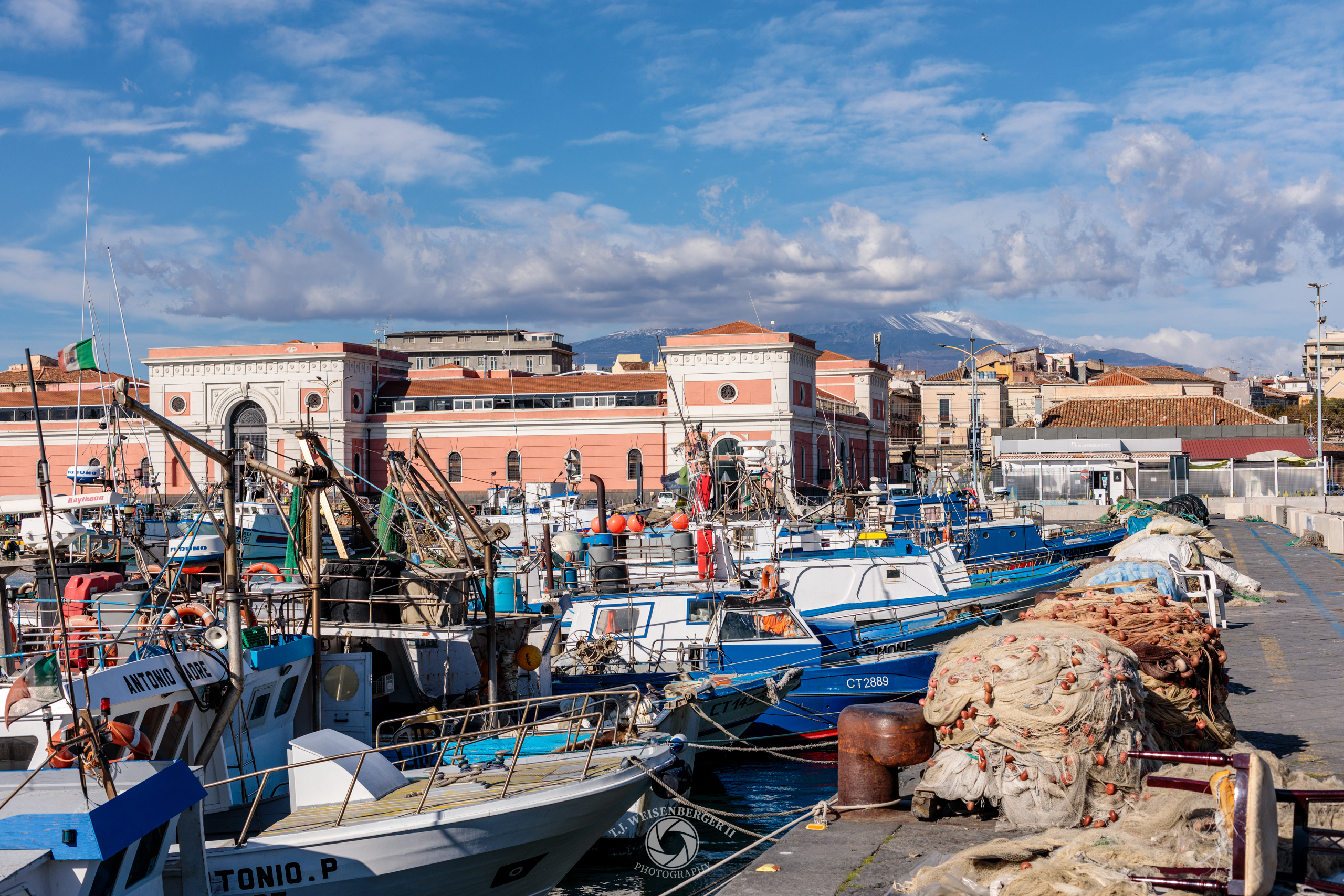 Fishing boats rest at the harbor, where nets, docks, and waterfront buildings reflect the working maritime life of Catania.