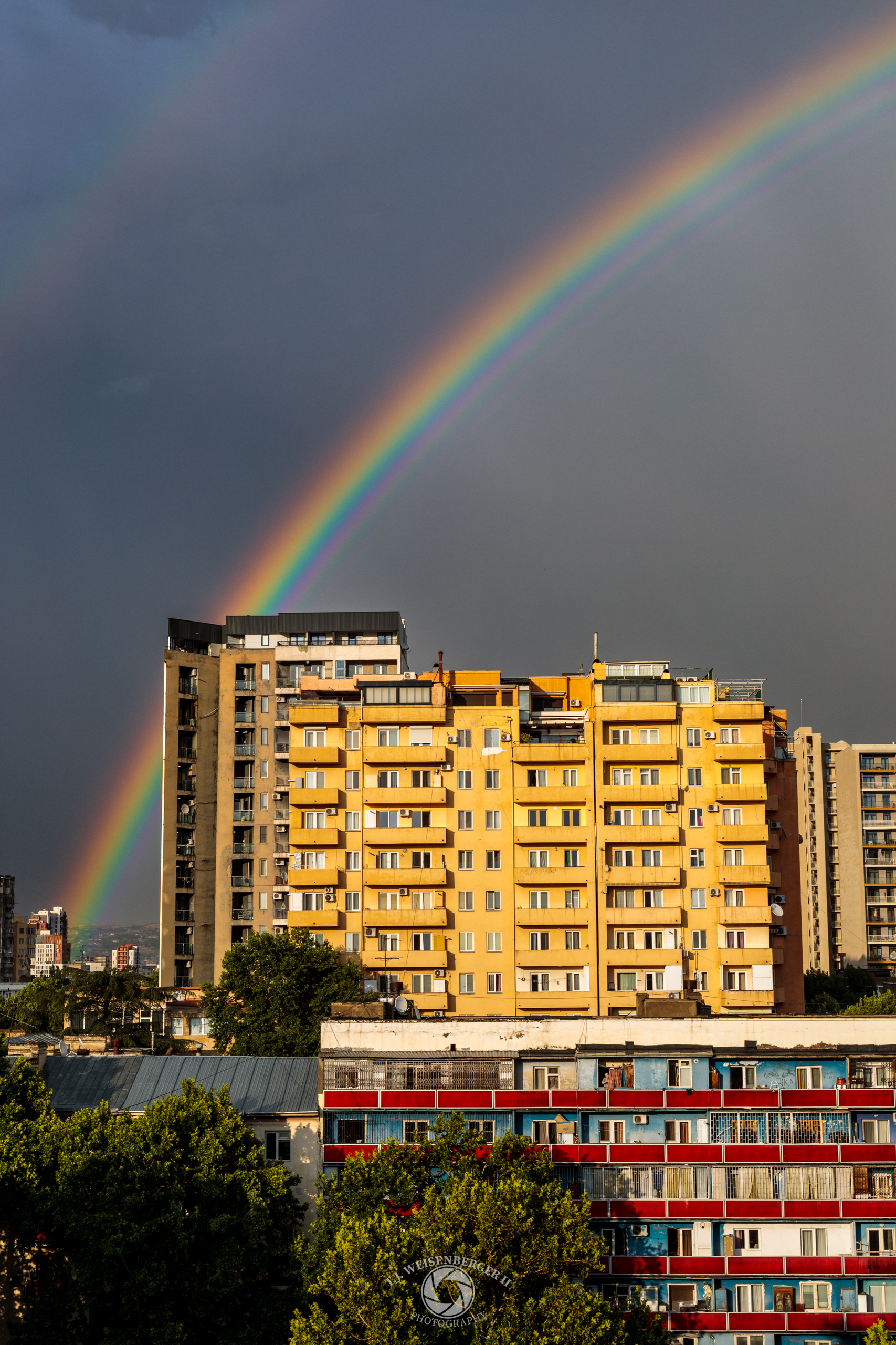 A double rainbow spans the skyline above Soviet-era apartment blocks, briefly transforming the urban landscape after a passing storm.