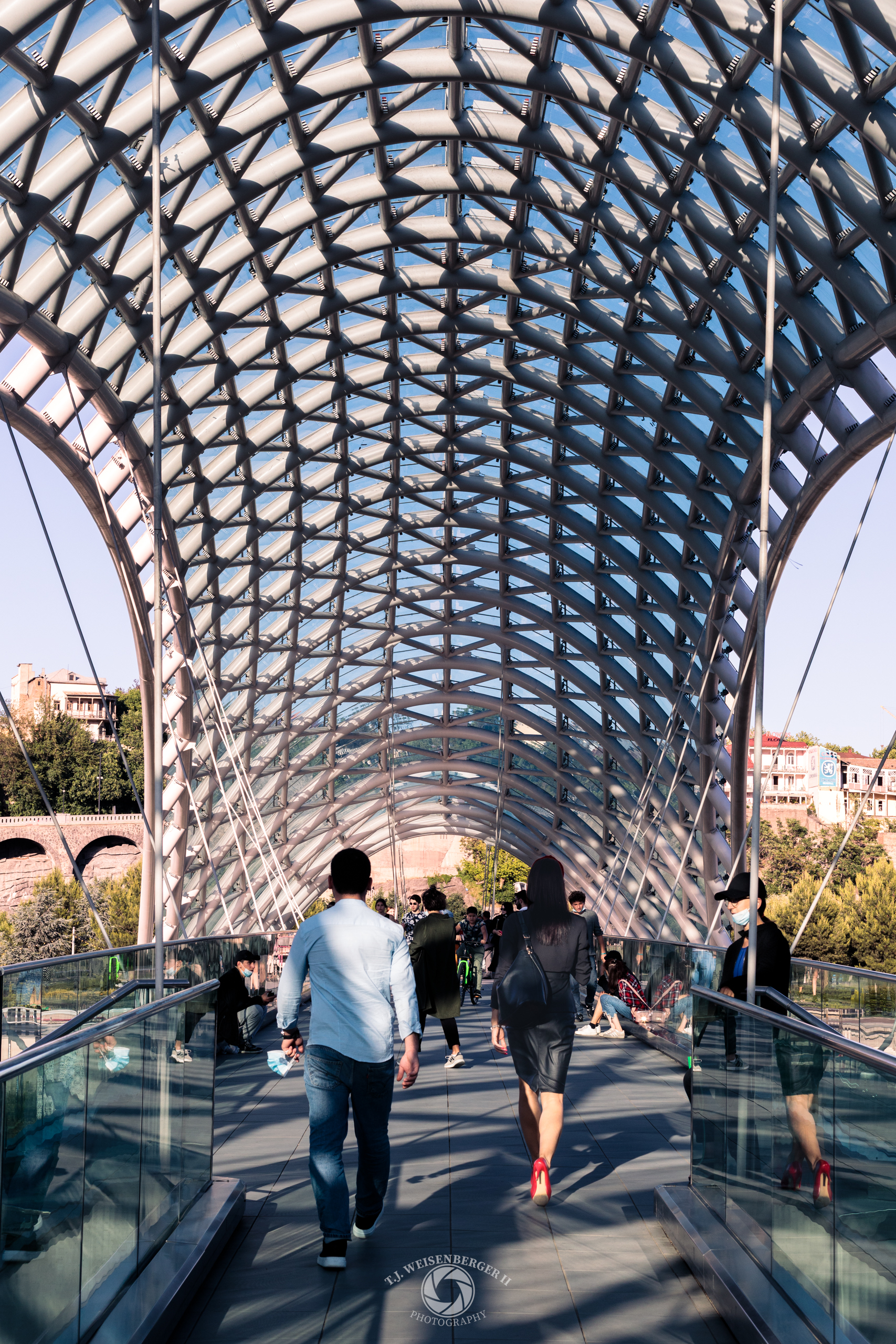 Pedestrians cross the Bridge of Peace, a modern glass-and-steel structure connecting old and new parts of the city.