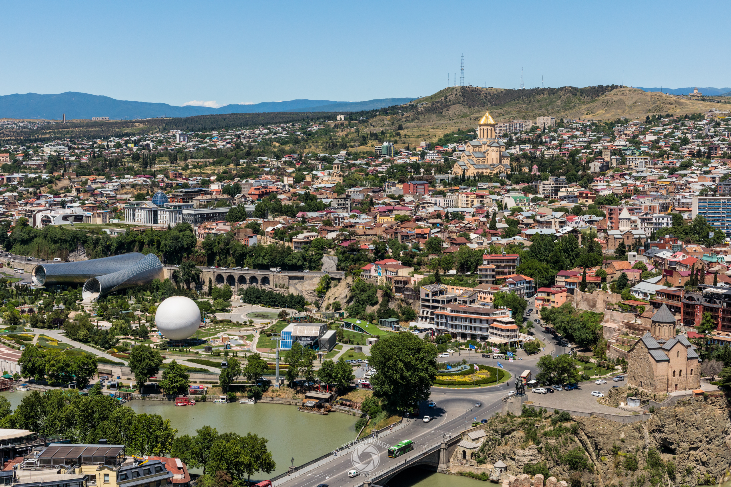 The city of Tbilisi stretches across hills above the Kura River, where historic churches and contemporary architecture coexist within the capital’s layered urban landscape.