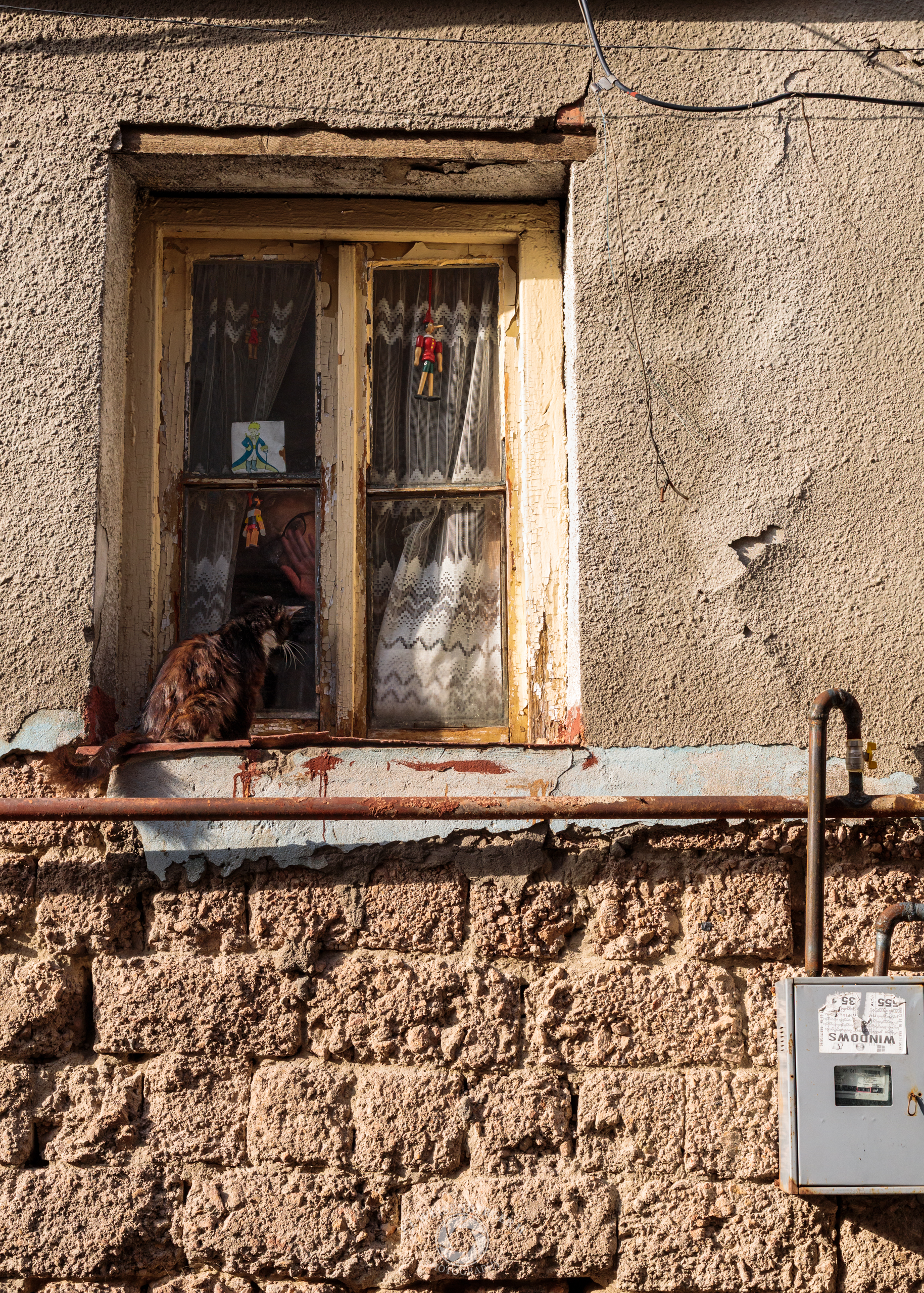 A woman waves as I photograph her cat on the window sill.