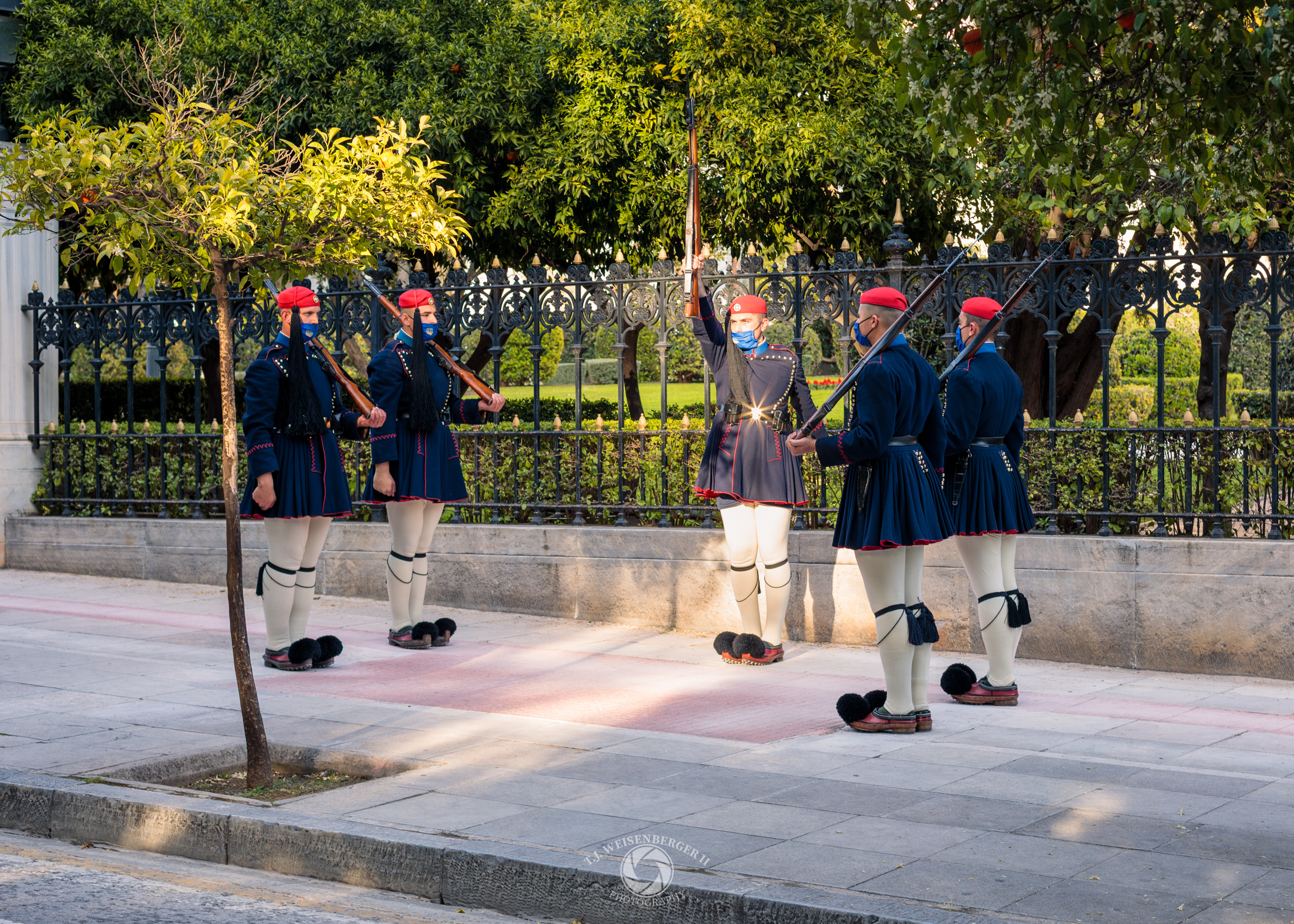 Evzones guards take part in the changing of the guard ceremony, a formal ritual rooted in Greek military tradition.