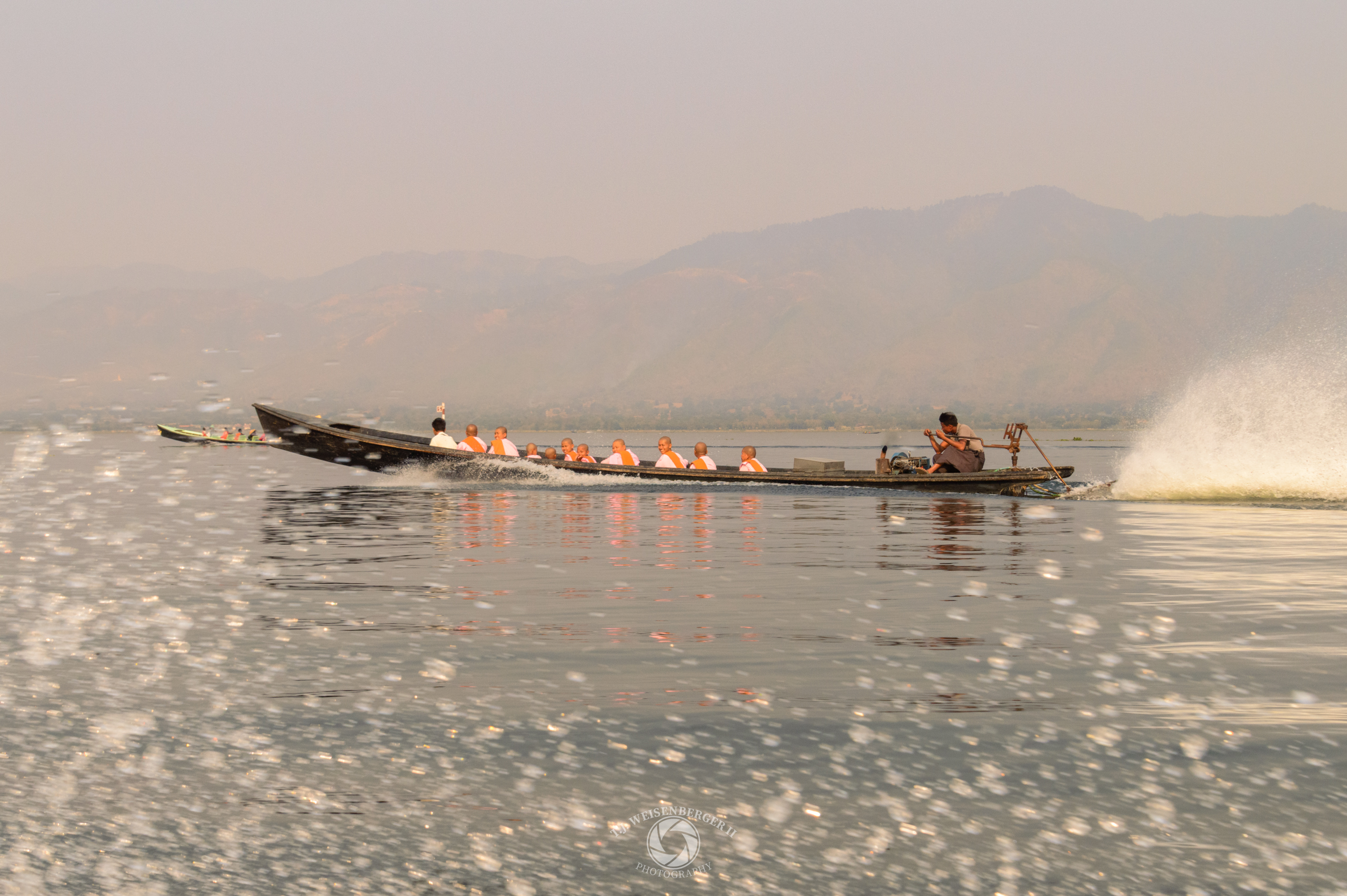 Thilashin, Burmese Buddhist nuns, cross Inle Lake by longboat, moving quietly across the water as part of daily life in the lake region.