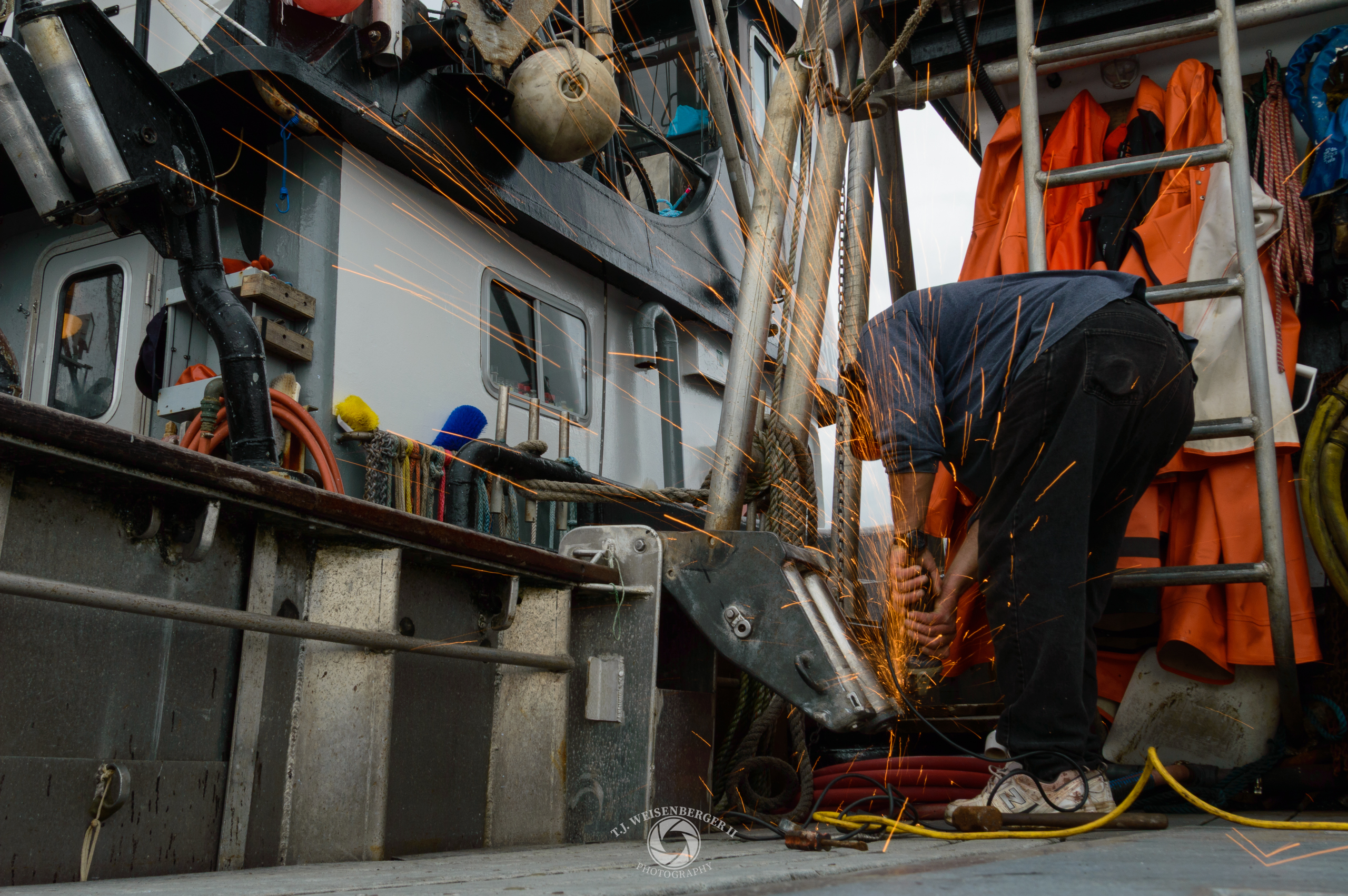 A fisherman cuts metal aboard a purse seiner, maintaining equipment during work at sea in Alaska’s commercial fishing industry.