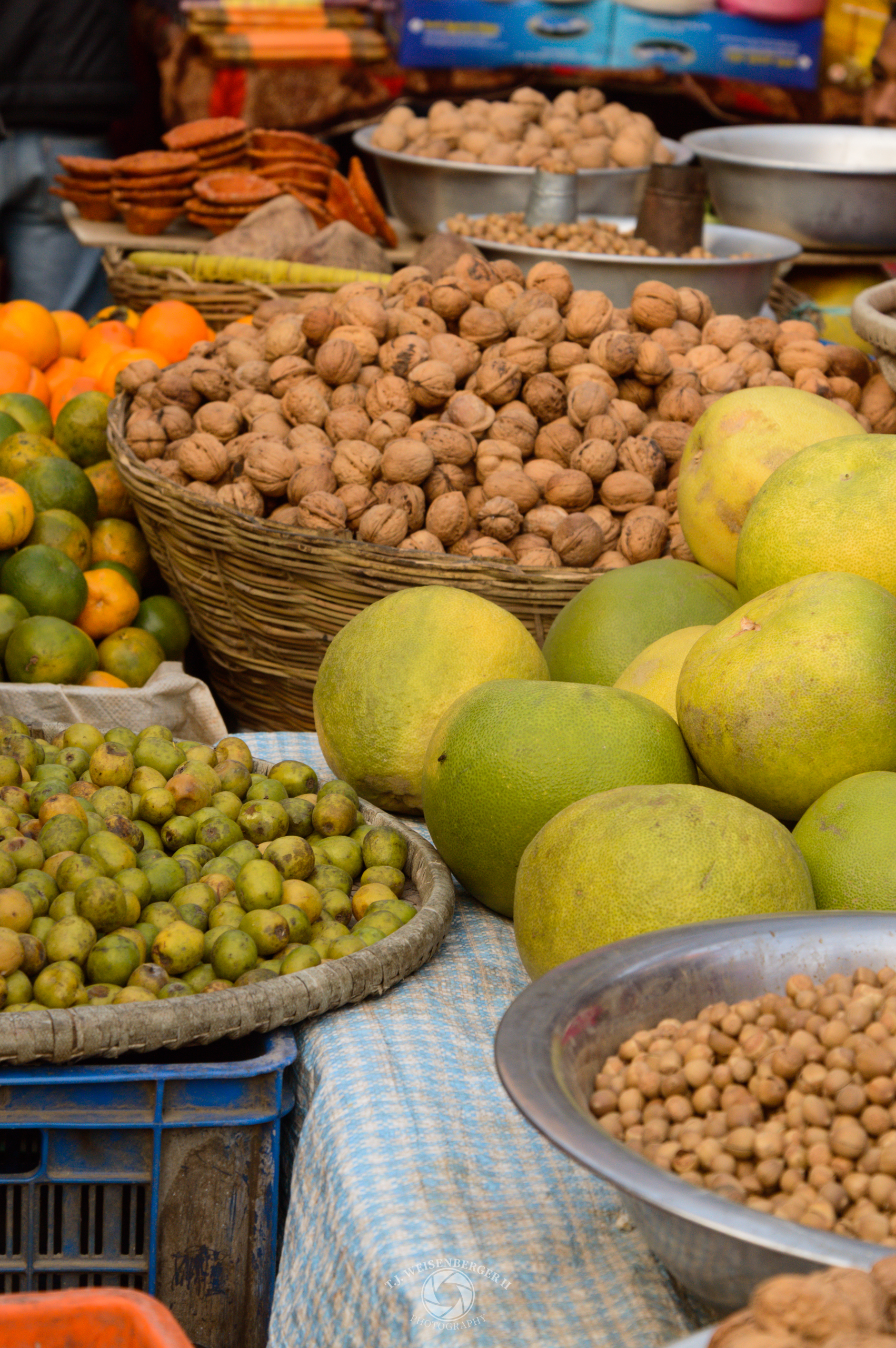 Walnuts, citrus, and dried goods are arranged for sale at a market stall, reflecting the everyday food culture of Kathmandu.