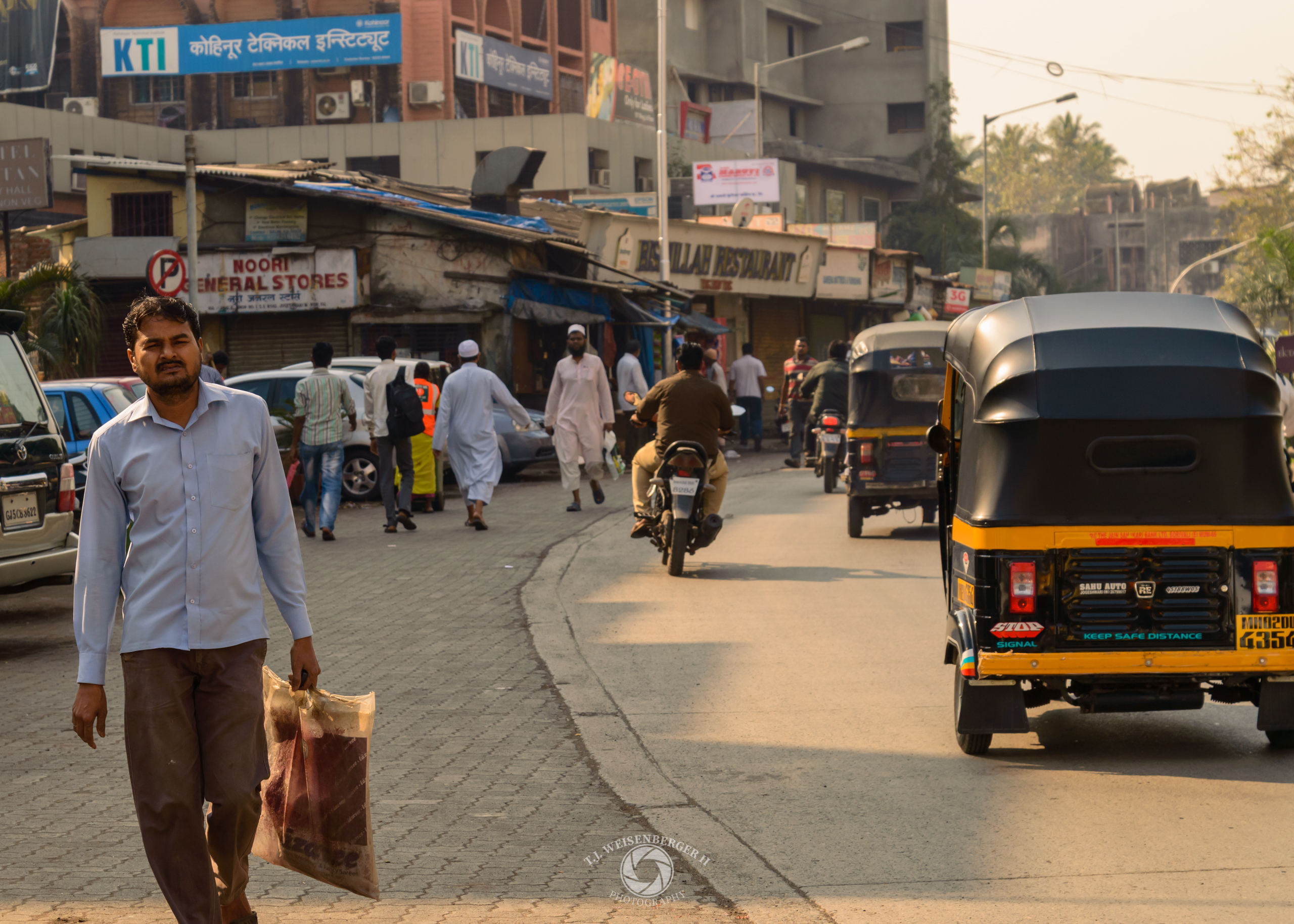 Pedestrians and traffic flow through a busy street, capturing the everyday movement and energy of life in Mumbai.